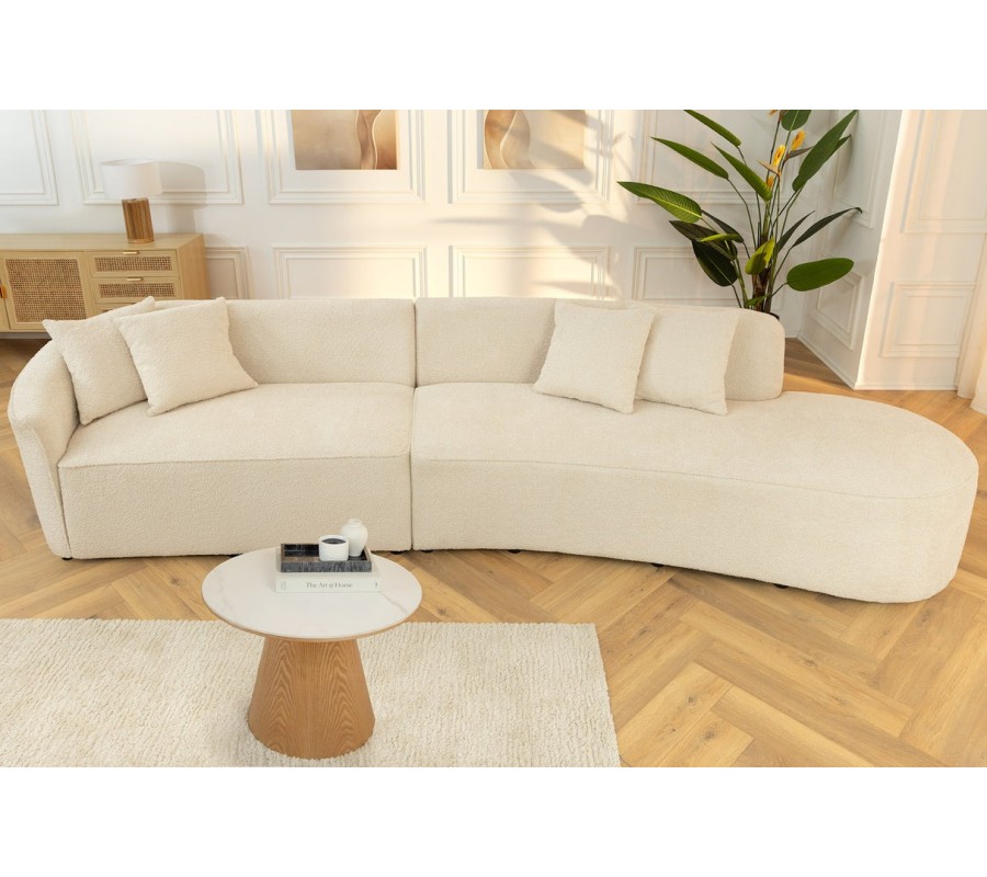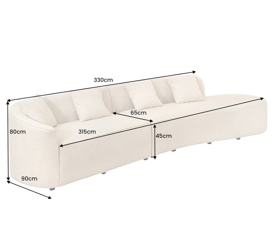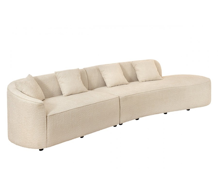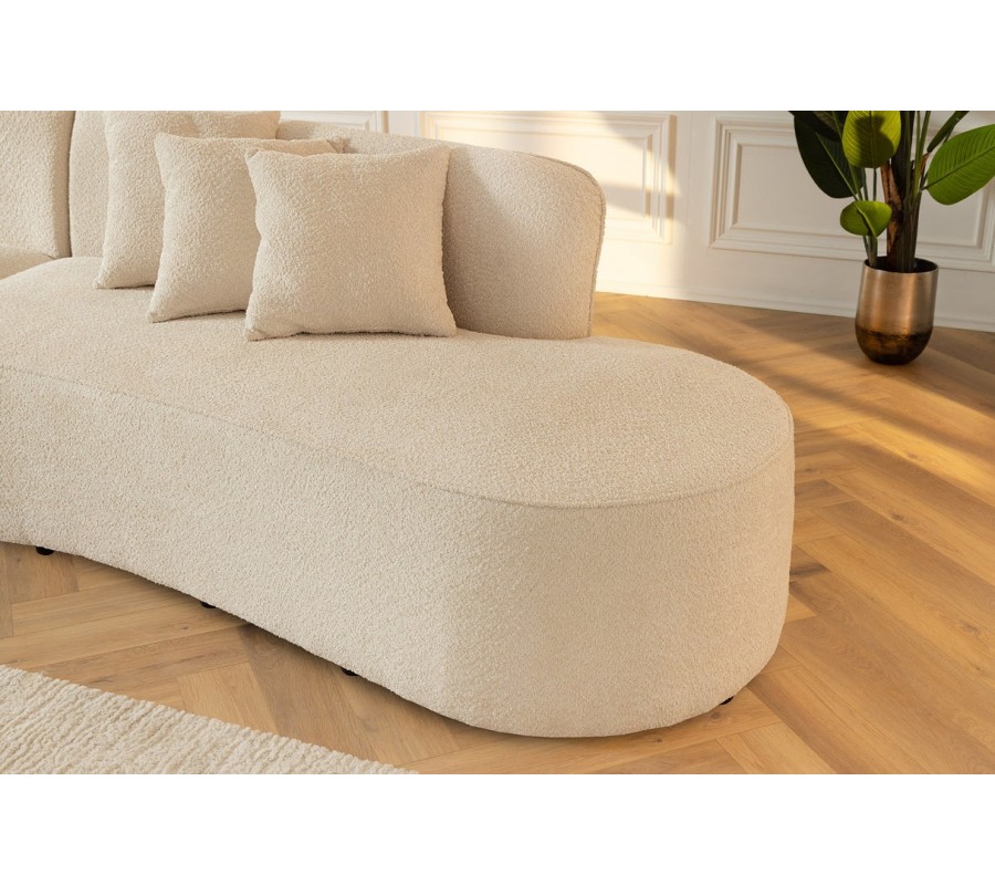 Dizajnová moderná sedačka Jina oválneho tvaru s bouclé poťahom v krémovej béžovej farbe a štyrmi vankúšmi 340 cm