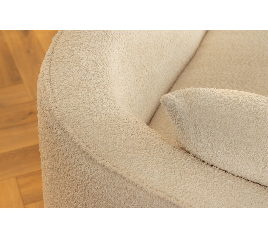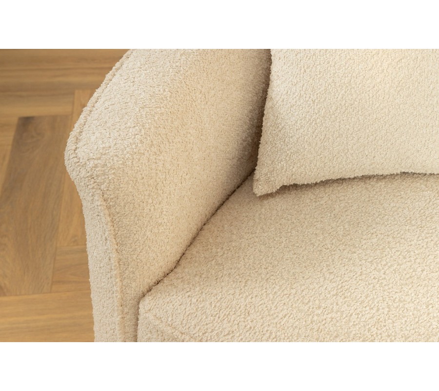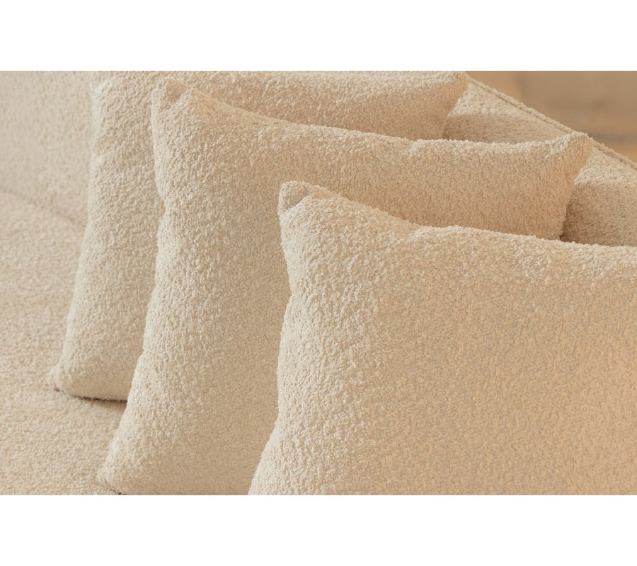 V spodnej časti sa nachádzajú nízke diskrétne nožičky. Zabezpečujú výbornú stabilitu nábytku a zároveň ich nie je vidieť, čo podčiarkuje moderný charakter. Vnútorná konštrukcia je vyrobená z kvalitného dreva a pokrytá mäkkým penovým čalúnením. Poťah je vyrobený z buklé látky v svetlom krémovo béžovom odtieni. Textúra materiálu je príjemná na dotyk a zároveň vytvára subtílnu vizuálnu štruktúru. Súčasťou balenia sú aj štyri štvorcové vankúše v rovnakom buklé prevedení.