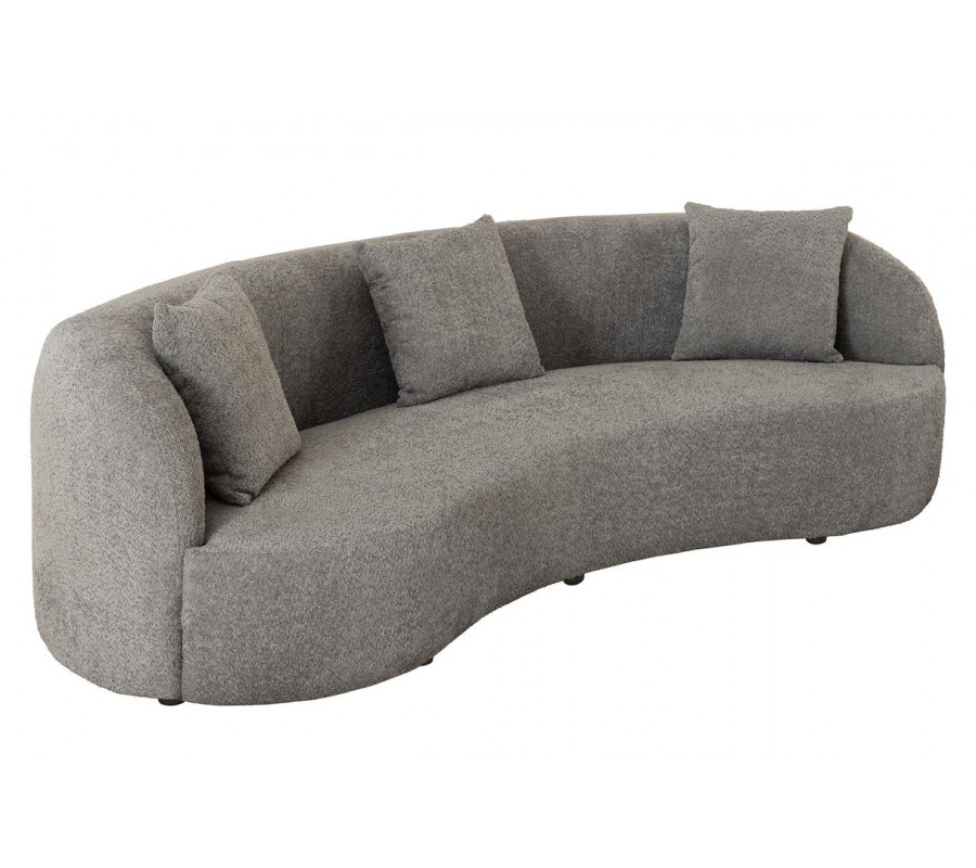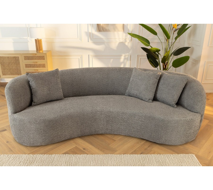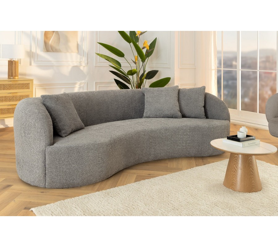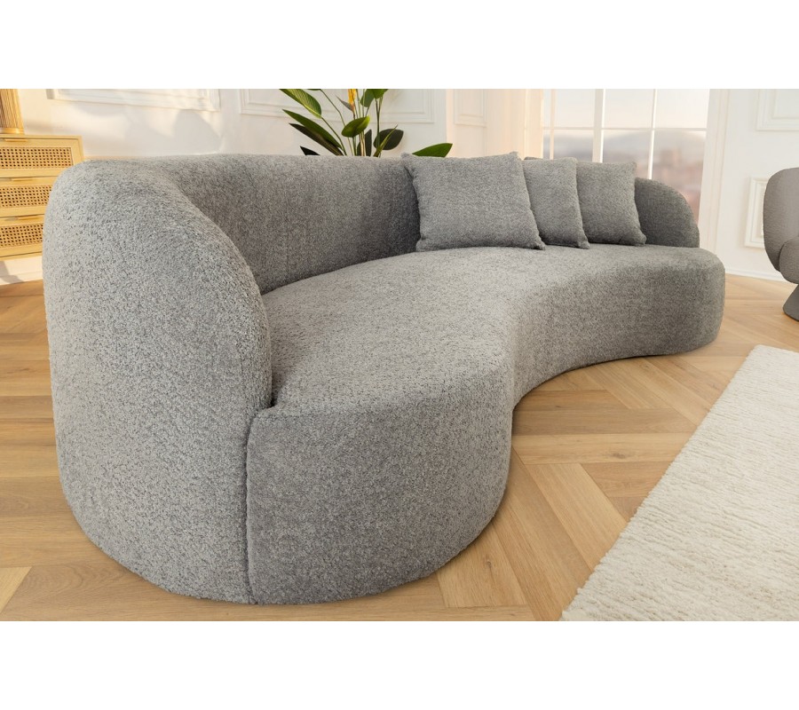 Dizajnová buklé trojmiestna sedačka Jina v oblúkovom tvare so sivým poťahom a tromi vankúšmi 229 cm