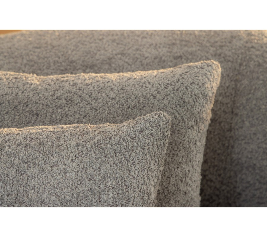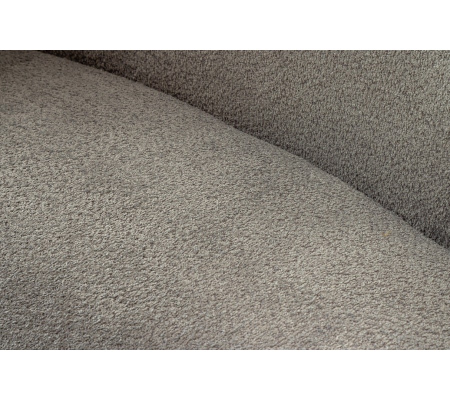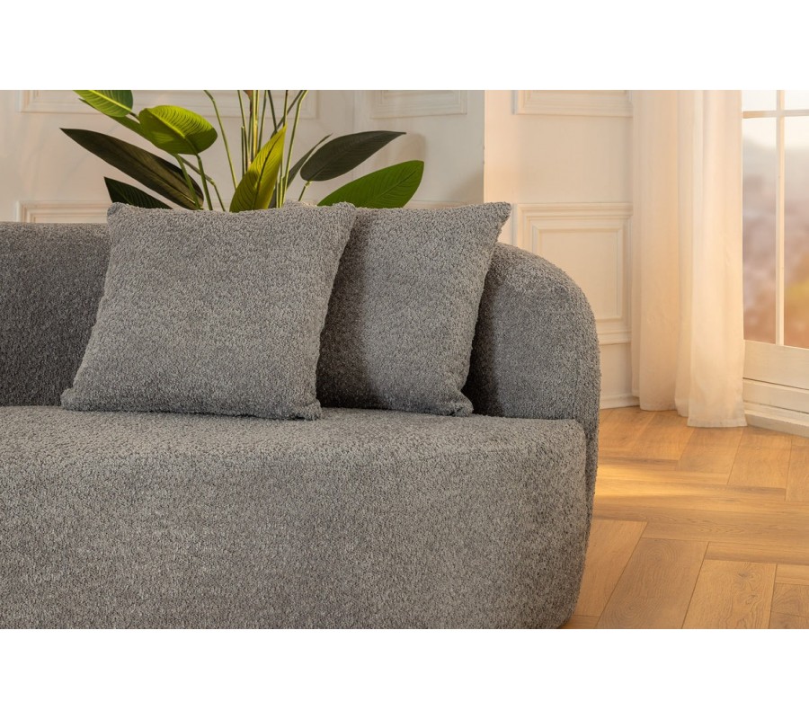 Sedačka má pevný drevený rám, pokrytý mäkkým penovým čalúnením a textilným buklé poťahom. Látka má výraznú štruktúru s drobnými slučkami, ktorá je príjemná na dotyk a zároveň vytvára zaujímavý vizuál. Sivá farba pôsobí elegantným dojmom a dodáva nábytku moderný nádych. Rovnaký poťah majú aj tri štvorcové vankúše.