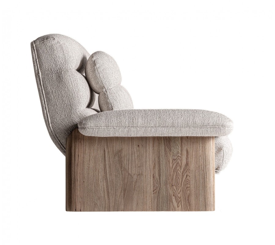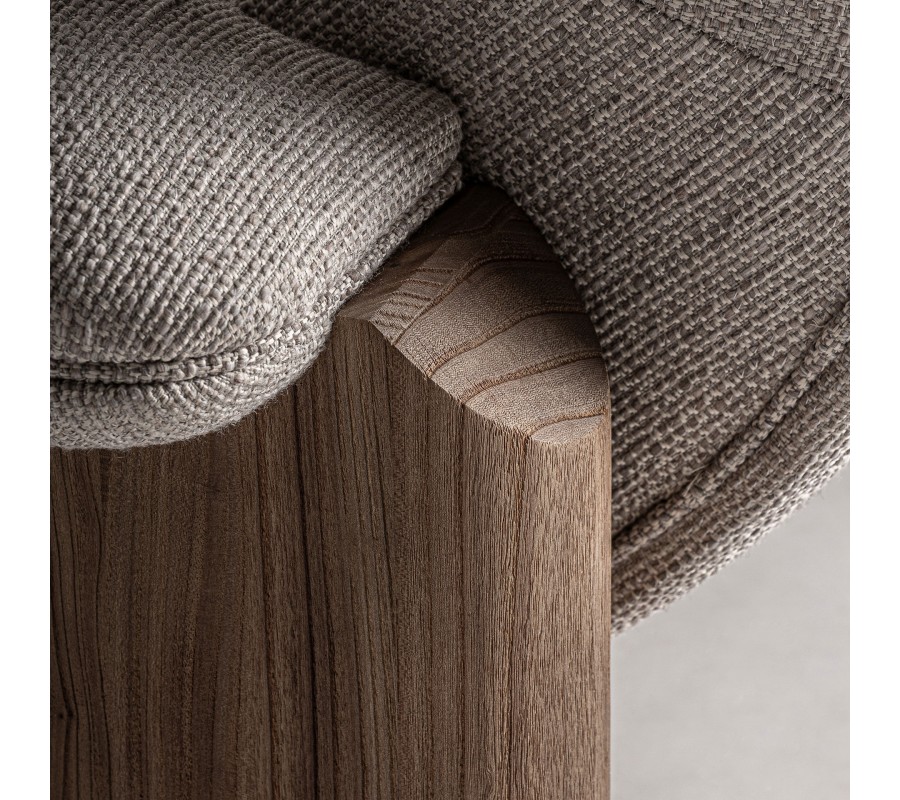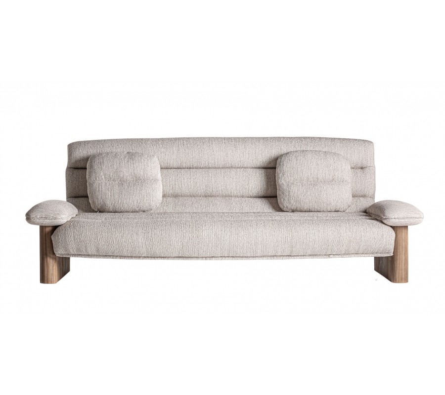 Poťah je vyrobený z odolnej polyesterovej látky s textúrou pripomínajúcou ľanové plátno a pôsobí v interiéri neutrálne, elegantne a vzdušne. Dva čalúnené vankúše slúžia ako pohodlná opora pre chrbát, zatiaľ čo bočné opierky s čalúneným vrchom poskytujú pohodlie aj pri relaxe do strán.