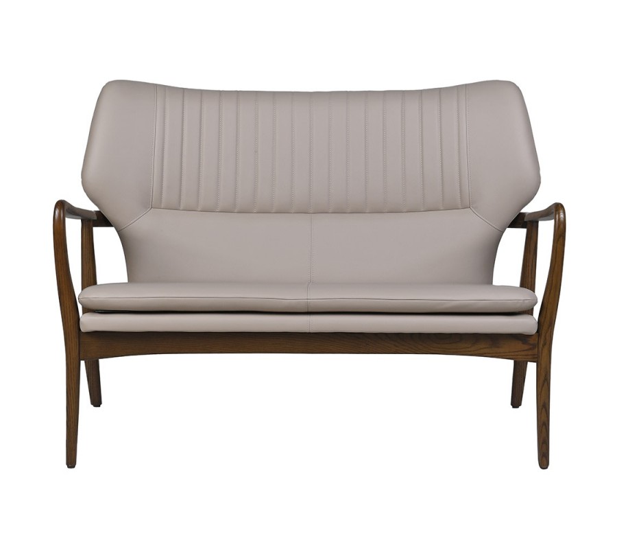 Luxusná dvojmiestna sedačka Vinton je elegantný kúsok, ktorý spája nadčasový dizajn s vysokou kvalitou spracovania. Jej základ tvorí konštrukcia z masívneho jaseňového dreva v hnedom odtieni so zvýrazneným lakovaným povrchom, ktorý podčiarkuje prirodzenú kresbu dreva. Štíhle vysoké nožičky z masívu dodávajú sedačke vzdušnosť a stabilitu, pričom bočné opierky na ruky majú šikmý tvar smerujúci k zadnej časti, čo dodáva celej siluete dynamiku.