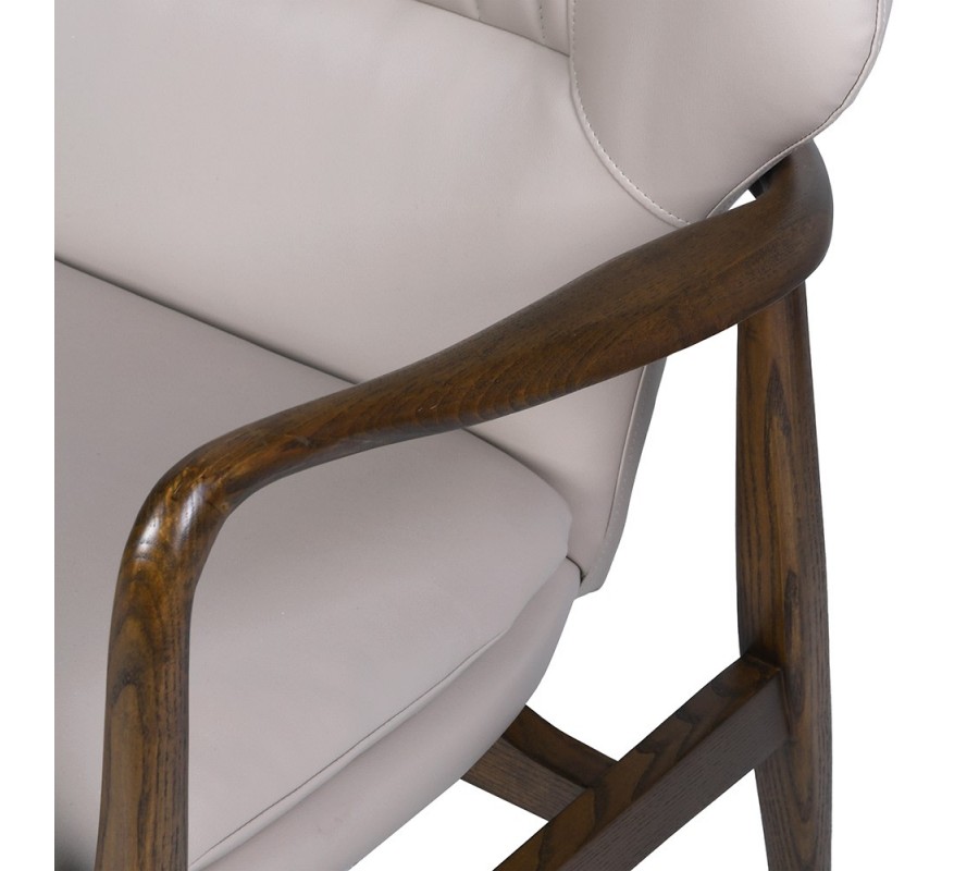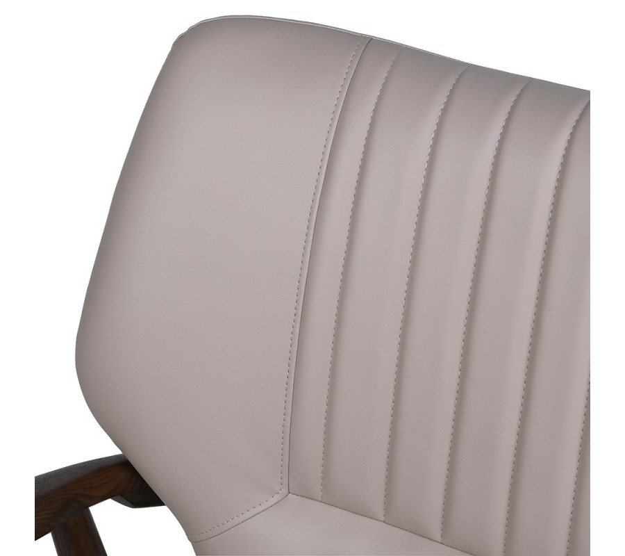 Sedadlo je riešené ako dvojvrstvové čalúnenie s poťahom z pravej kože v béžovej farbe, ktoré poskytuje komfort a luxusný vzhľad. Zadná opierka chrbta je potiahnutá tou istou kvalitnou kožou a v jej hornej časti zdobená vertikálnym rebrovaným prešívaním, ktoré pripomína interiér automobilových sedadiel. V spodnej časti opierky sa nachádzajú jemné výrezy, ktoré zvyšujú estetickú hodnotu a zároveň dodávajú celku ľahkosť.