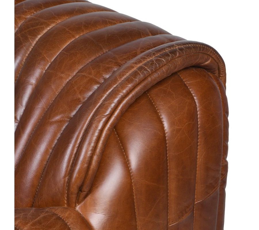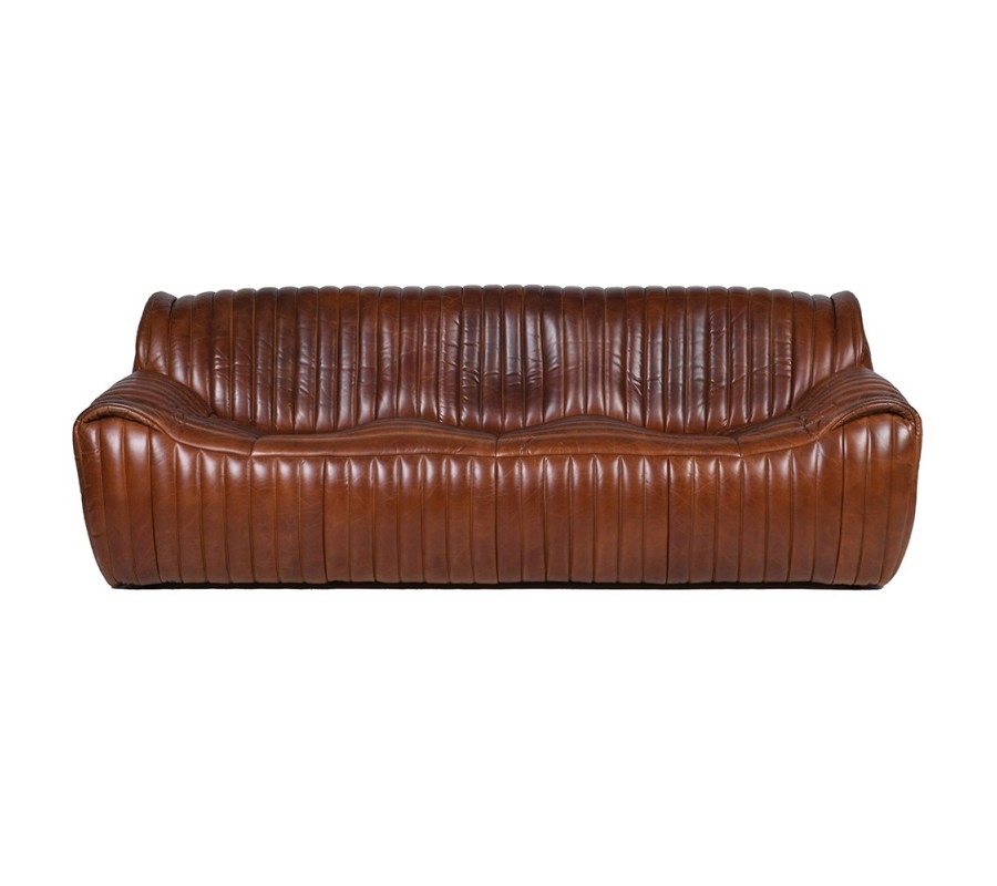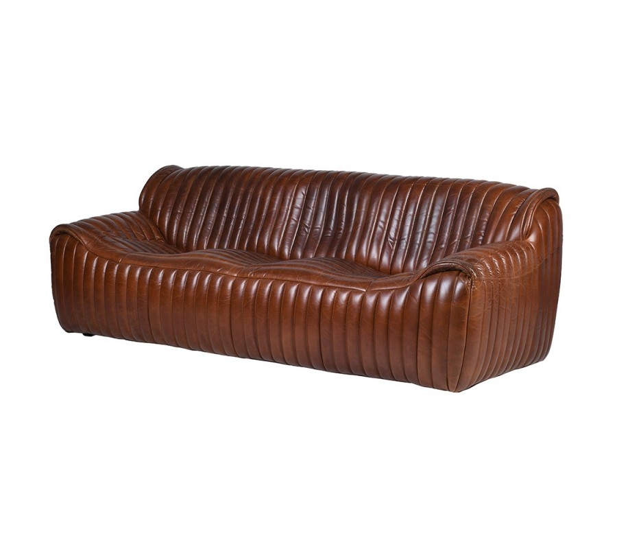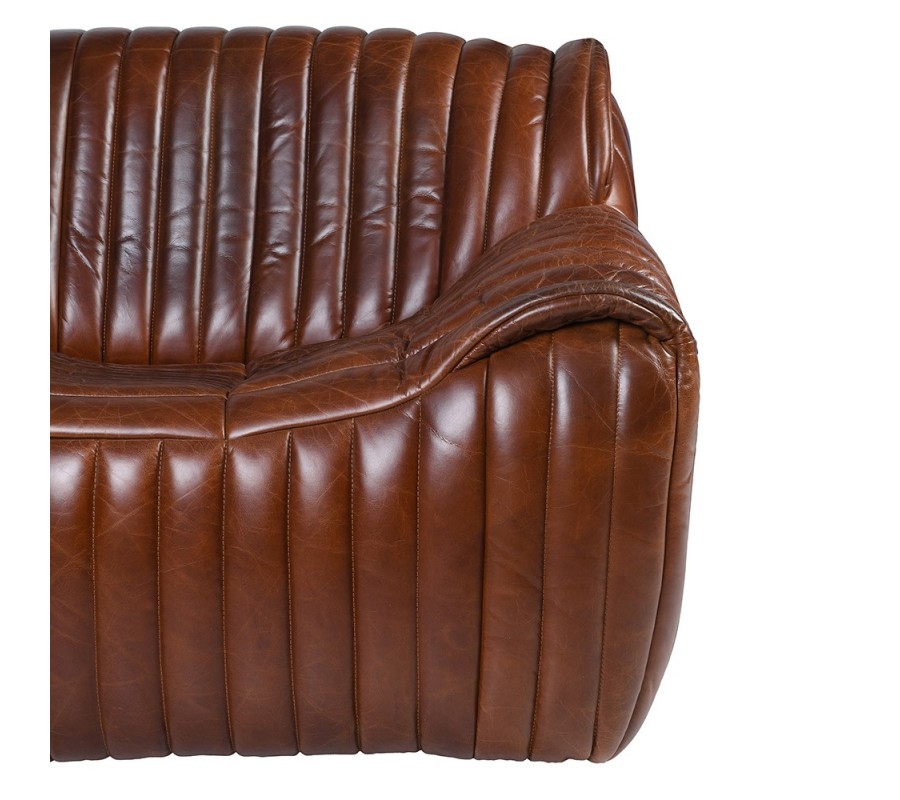 Luxusná retro sedačka Milano predstavuje ikonický dizajn so silným charakterom a výnimočným komfortom. Je čalúnená a potiahnutá kvalitnou pravou hnedou kožou, ktorá vyniká prirodzenou textúrou a elegantným leskom. Výrazné vrúbkované vertikálne prešívanie prechádza plynule od sedacej časti cez operadlo až po bočné opierky, čím dodáva sedačke dynamiku a originálny vzhľad.