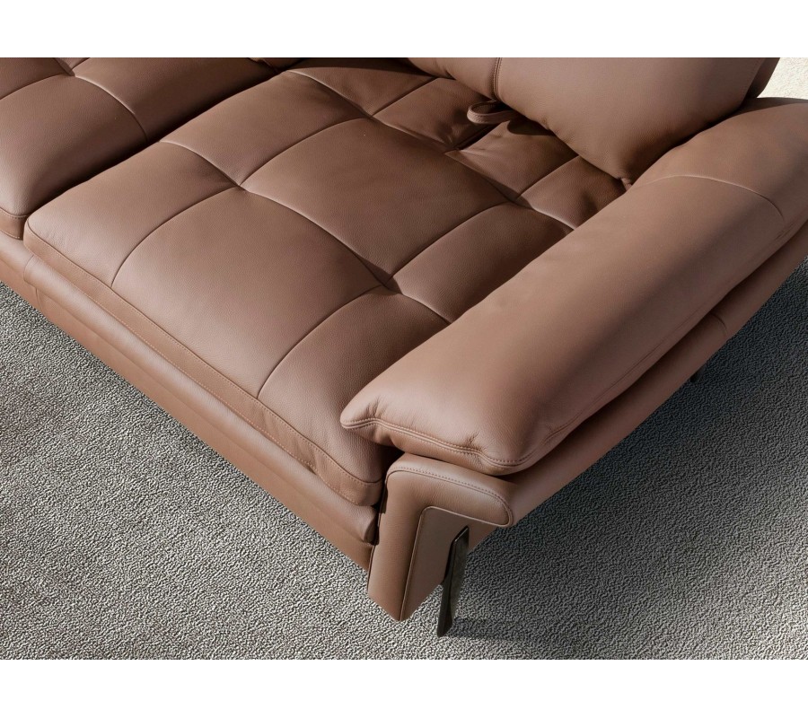 Pevný rám z masívneho dreva pokrýva penová výplň a poťah z pravej kože, ktorý zdobí na sedacej časti prešívanie so štvorcovým vzorom typu capitone, a na opierkových vankúšoch minimalistické prešívanie v tvare T. Poťah má naturálnu teplú hnedú farbu a hladký, na dotyk príjemný povrch.