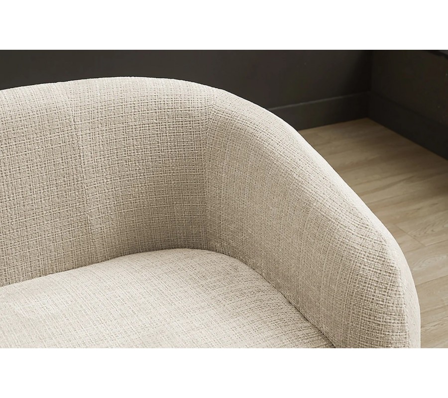 Nenápadné čierne nohy dodávajú sedačke vizuálnu ľahkosť a jemný kontrast k svetlému čalúneniu, pričom podporujú moderný a minimalistický charakter celého modelu. Vnútorný sedací priestor so šírkou 159 cm poskytuje komfortné miesto na sedenie pre dve až tri dospelé osoby.