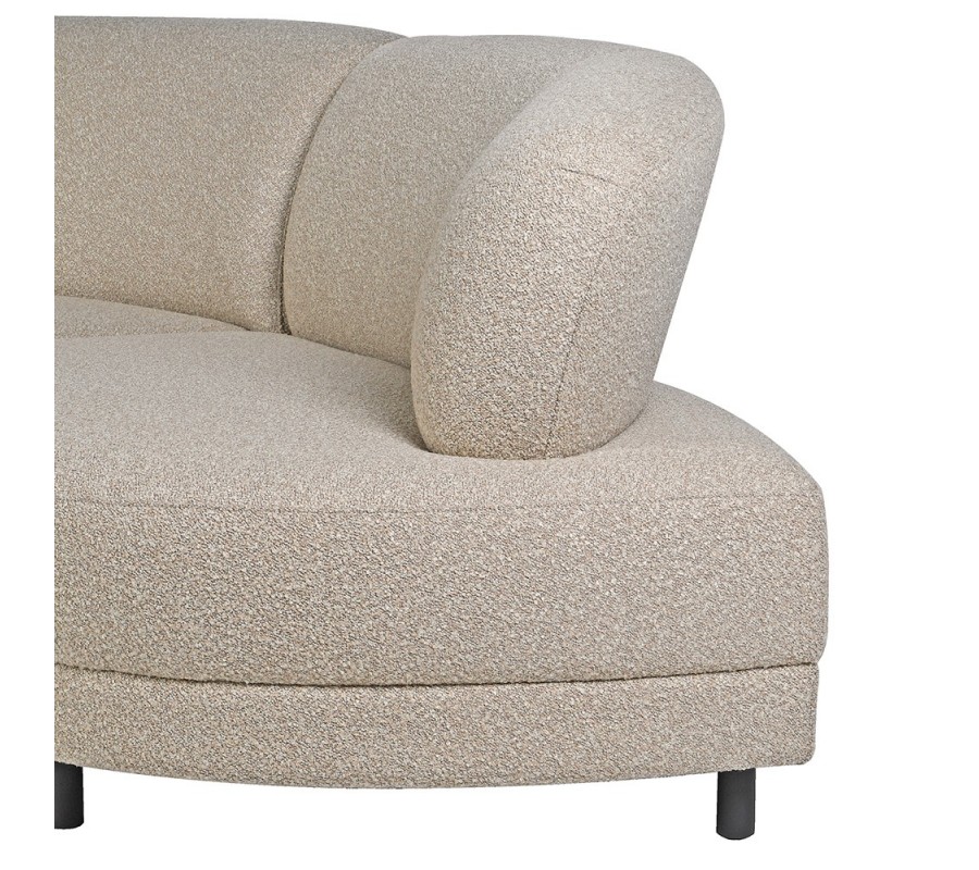 Sedačka má pevnú konštrukciu z masívneho dreva, ktorú pokrýva mäkká penová výplň a poťah z mikrovlákna. Textília je mimoriadne odolná voči vplyvom každodenného používania a buklé štruktúra s drobnými slučkami pôsobí teplým a útulný dojmom, pričom je taktiež príjemná na dotyk. Svetlá krémovo béžová farba je elegantná s v kombinácii s ladnými organickými tvarmi dodáva sedačke luxusný minimalistický výraz.
