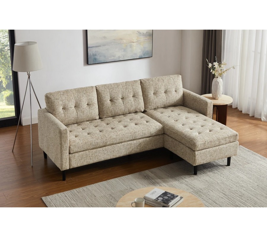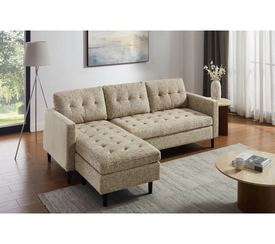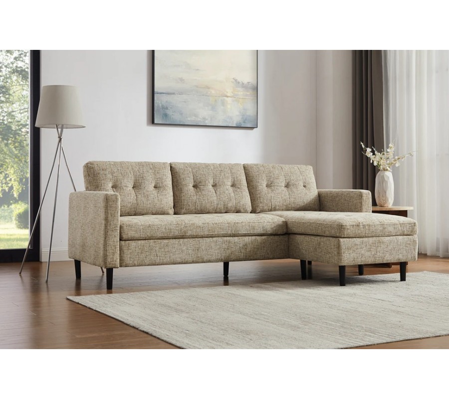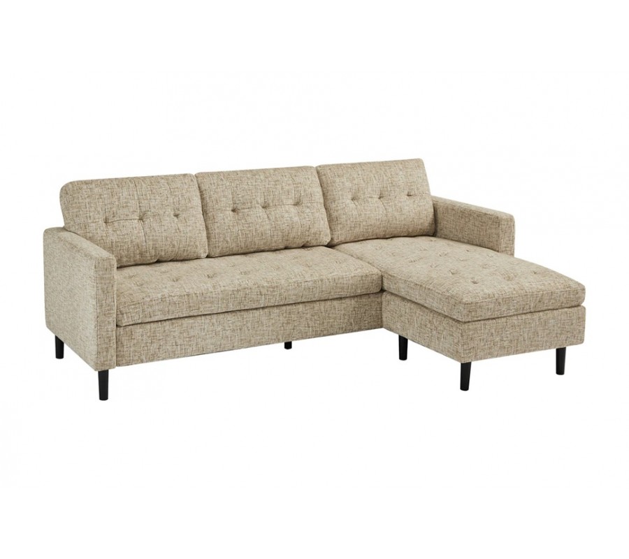Sedačka má tvar L, s možnosťou umiestnenia rohovej časti na pravú alebo ľavú stranu a poskytne miesto na sedenie pre tri osoby. Penové čalúnenie a pružinové jadro zaručujú výbornú odolnosť voči vplyvom každodenného používania. Valcovité čierne nožičky sú vyššie, čo dizajn vizuálne odľahčuje a zároveň uľahčuje upratovanie pod nábytkom.