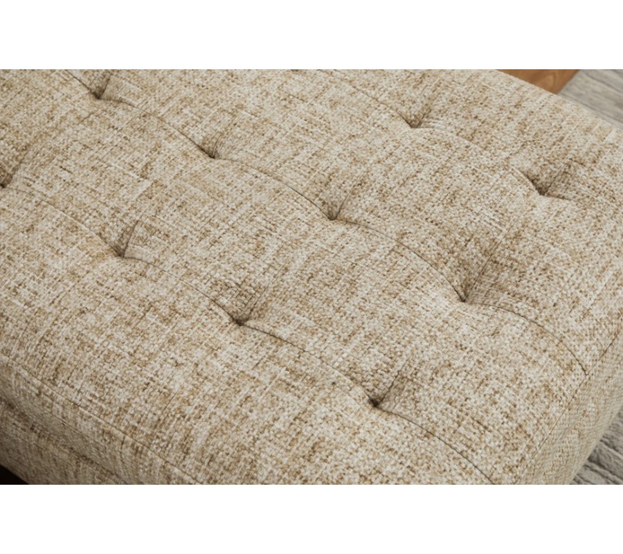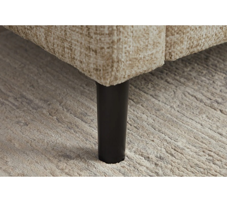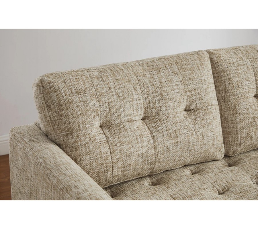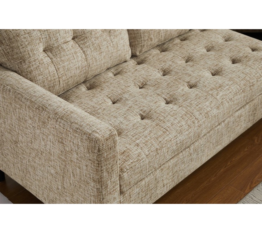 Sedaciu časť zdobí hlboké bodové prešívanie, ktoré vytvára minimalistický dekoratívny prvok. Opakuje sa aj na troch obdĺžnikových opierkových vankúšoch. Bočné strany prekrývajú obdĺžnikové panely tvoriace opierky na ruky a na zadnej strane ich prepája chrbtová opierka s rovnakou výškou. Poťah je vyrobený z pevného mikrovlákna s výrazným tkaním, ktoré v kombinácii so svetlejšími a tmavšími béžovými odtieňmi dodáva sedačke príjemnú vizuálnu aj dotykovú štruktúru.
