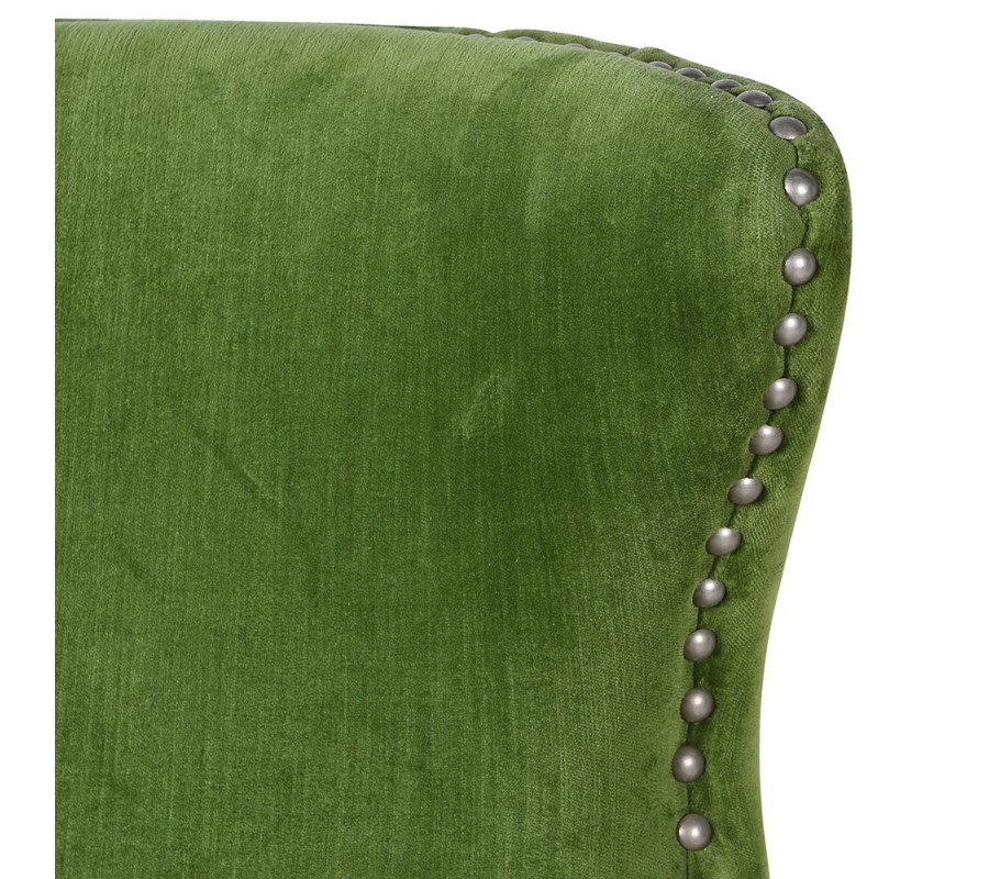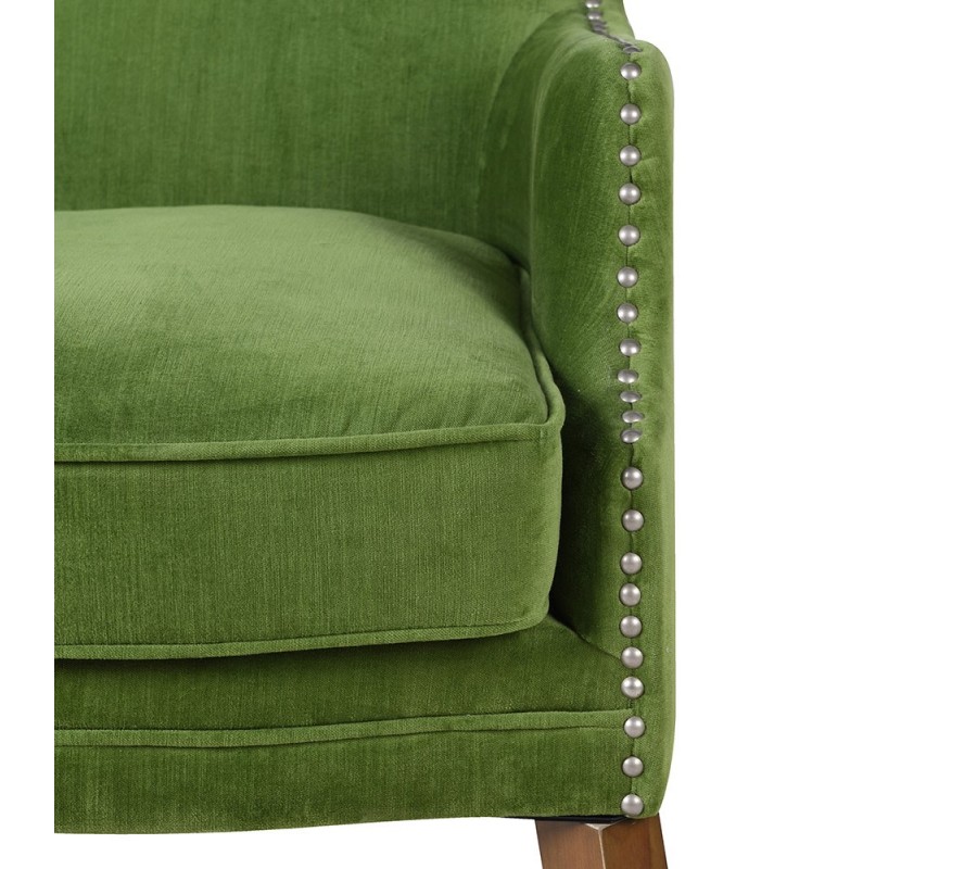 Sedacia časť má pevný drevený rám, pokrytý penovou výplňou a zamatovým poťahom vo sviežej zelenej farbe. Mikrovlákno dodáva textílii výbornú odolnosť voči vplyvom každodenného používania a je príjemné na dotyk. Okraje chrbtovej a bočných opierok zdobí vybíjanie okrúhlymi striebornými nitmi.