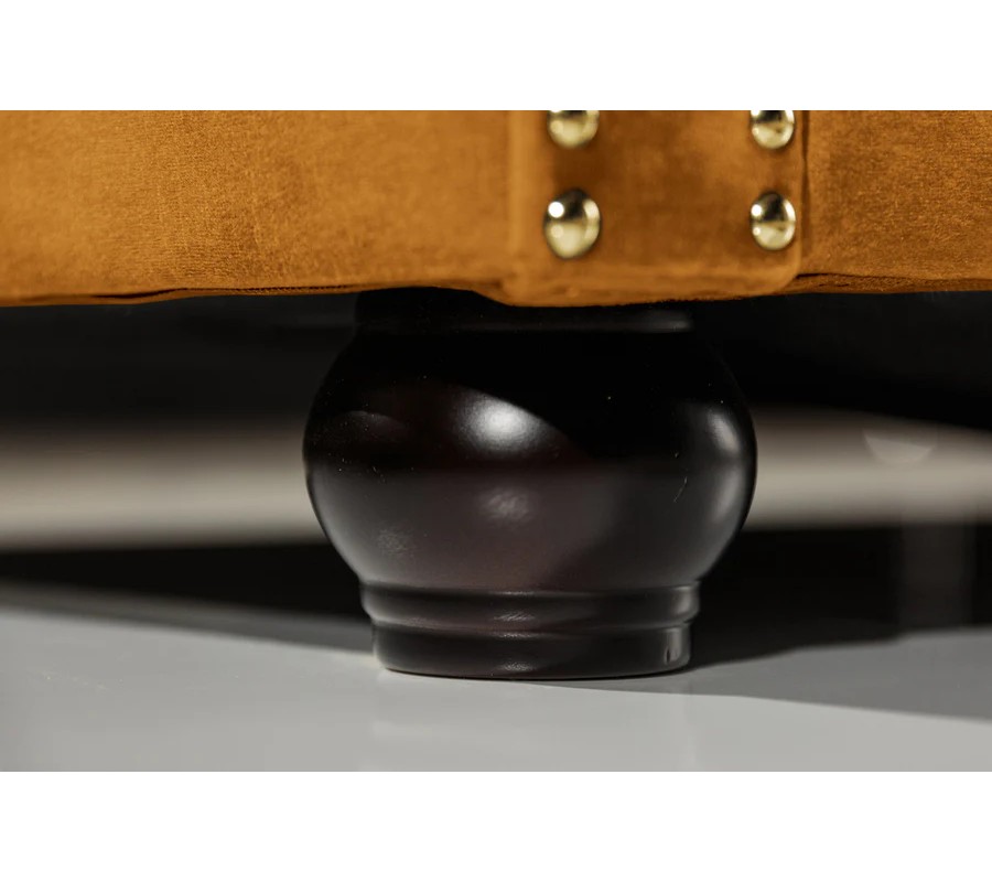 Sedacia časť disponuje tromi štvorcovými vankúšmi, ktoré zabezpečujú pohodlné sedenie pre tri osoby. Spodnú časť konštrukcie zdobí pás s okrúhlymi gombíkmi, čo prepája celkový dizajn sedačky. Disponuje štyrmi zaoblenými nožičkami z masívneho topoľového dreva v čiernej farbe, ktoré pôsobia elegantne a zároveň nechávajú vyniknúť horčicový zamat.