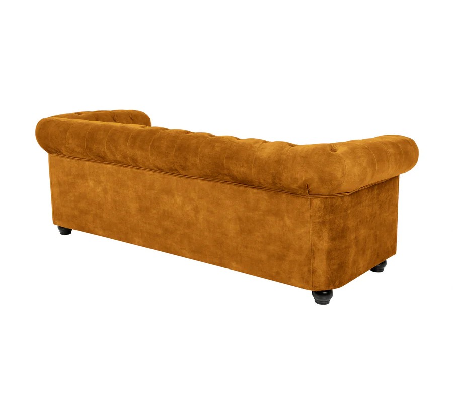 Dizajnová zamatová chesterfield trojmiestna sedačka Maya v horčicovej farbe s okrúhlymi čiernymi nožičkami 205 cm