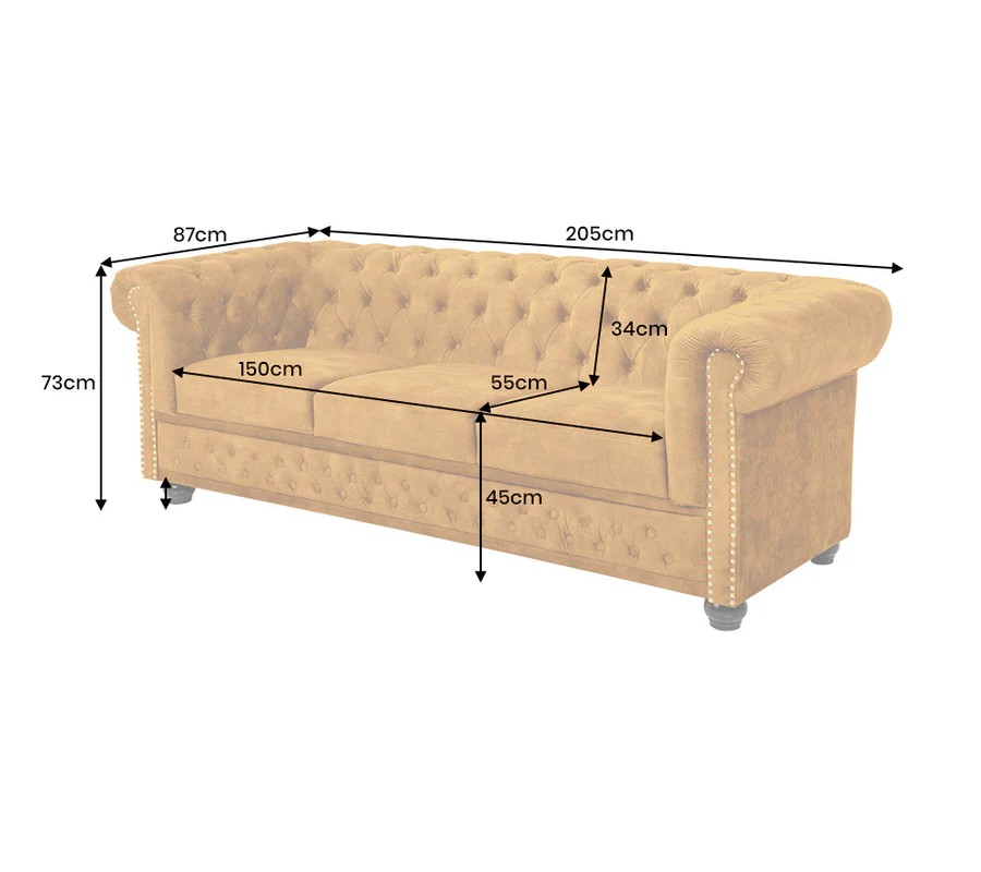Dizajnová sedačka Maya prinesie do interiéru jedinečný vzhľad s dôrazom na eleganciu, štýl a jemný historický nádych, ktorý je pre chesterfield nábytok typický. Je potiahnutá zamatovou textíliou v horčicovej farbe, ktorá pôsobí teplo a výrazne. Hebká štruktúra zamatu dodáva celku hĺbku a vizuálne zjemňuje mohutné línie sedačky.