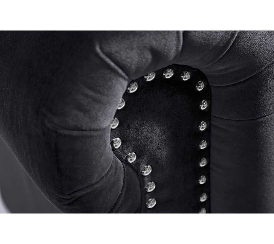 Trojmiestna chesterfield sedačka Maya pôsobí elegantne a nadčasovo, vďaka čiernej zamatovej textílii, ktorá dodáva povrchu jemný lesk a hĺbku. Tento poťah z mikrovlákna je vysoko odolný a pevný, pričom si zachováva vizuálnu mäkkosť.