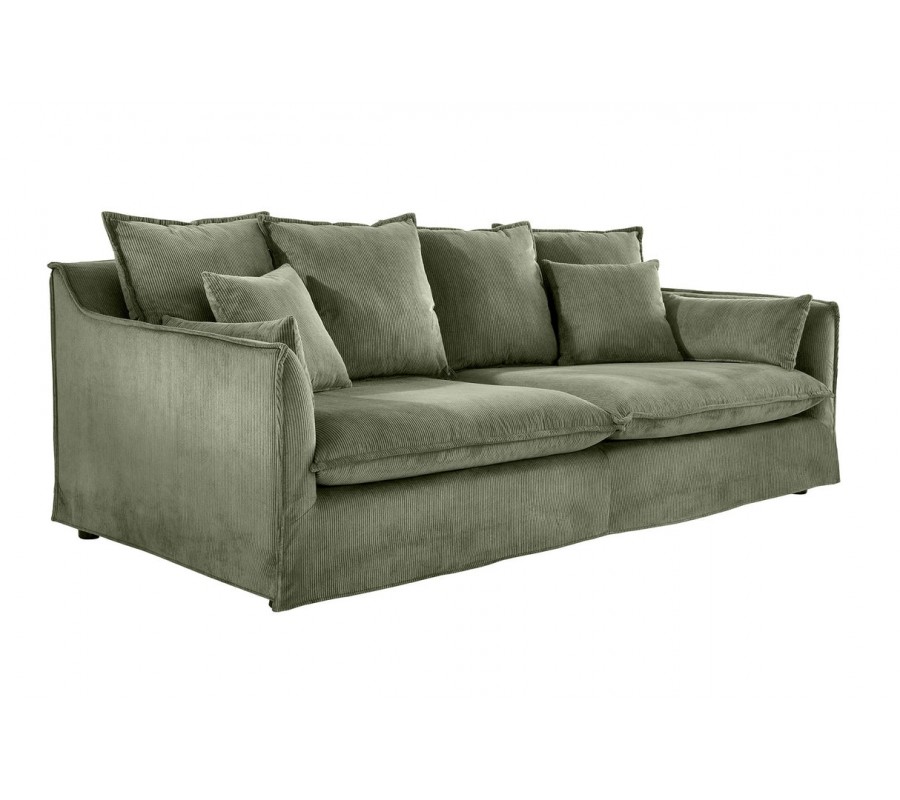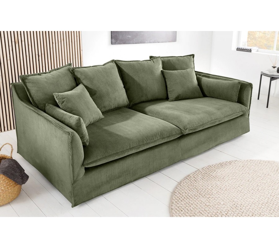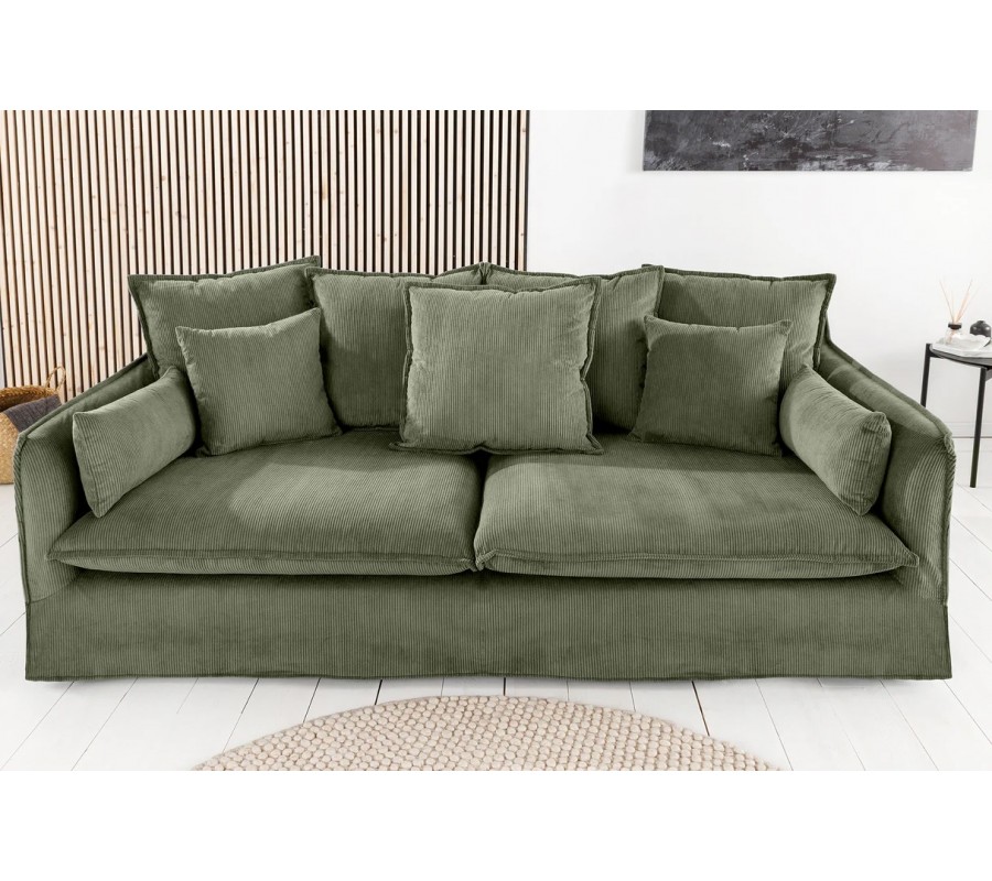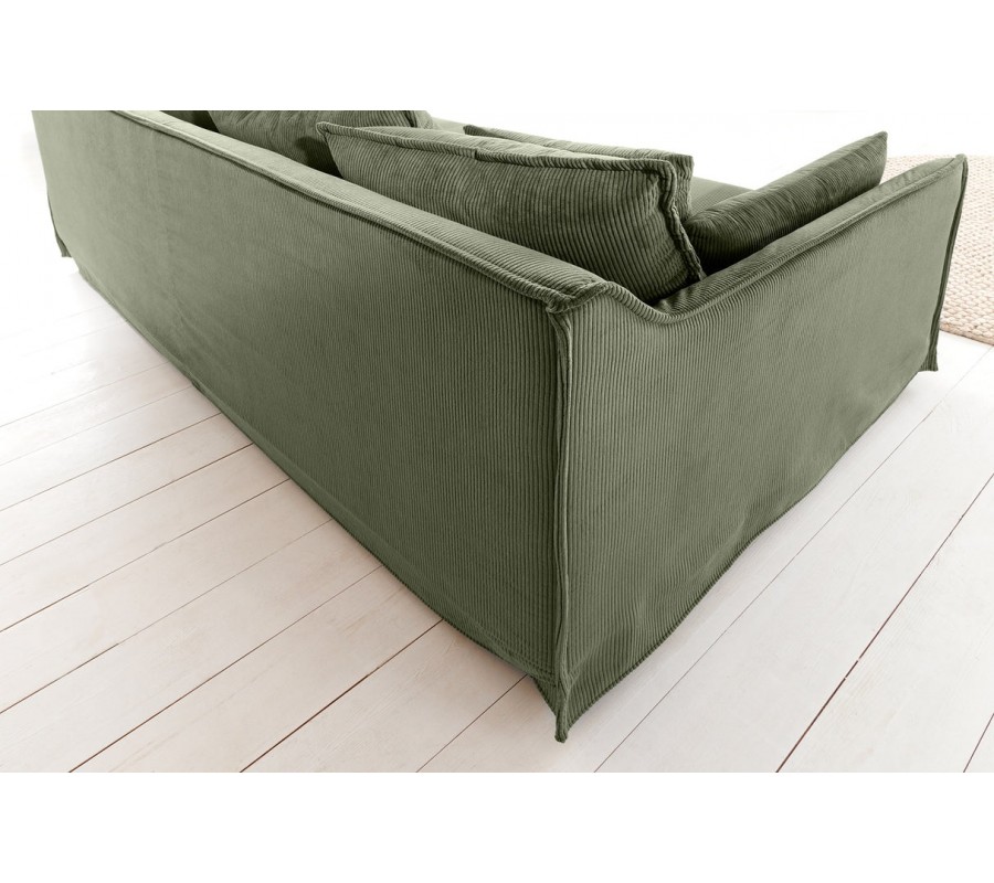Dizajnová škandinávska trojmiestna sedačka Heaven so šalviovo zeleným odnímateľným menčestrovým poťahom a vankúšmi 200 cm