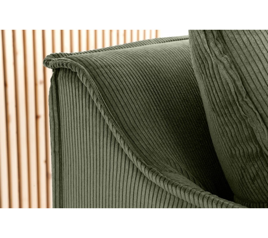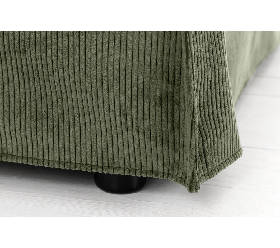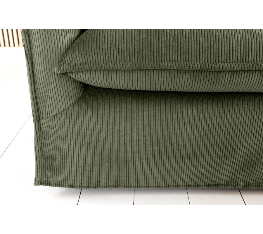 Samotná sedačka aj vankúše sú vyrobené v rovnakom menčestrovom prevedení v šalviovej zelenej farbe. Lineárna štruktúra látky pôsobí útulným dojmom a okraje vankúšov a opierky zdobí výrazné šitie, podčiarkujúce mäkký vizuál. Poťah je odnímateľný, čo zjednodušuje čistenie a údržbu nábytku.