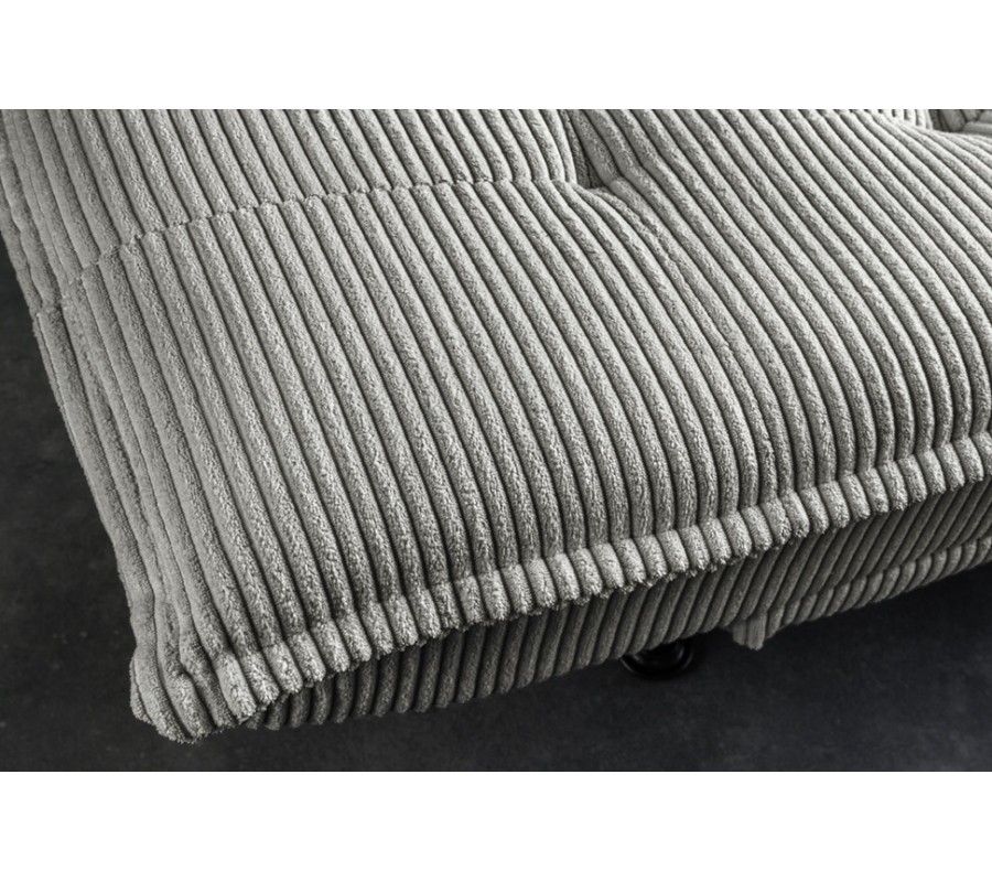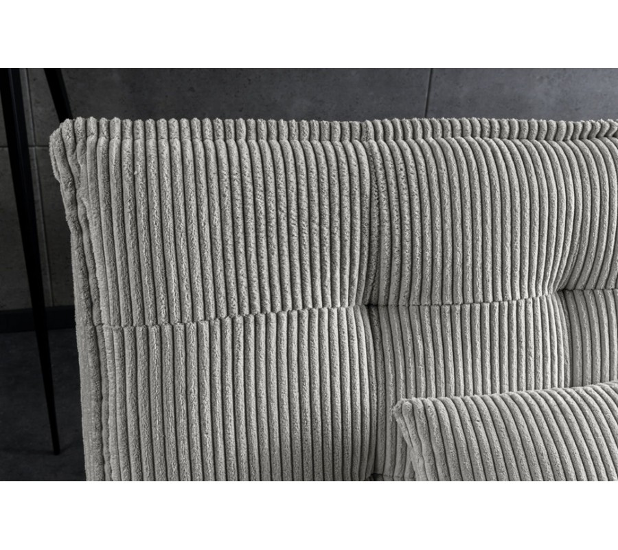 Sedačka je čalúnená menčestrovou látkou v neutrálnej sivej farbe, ktorá pôsobí nadčasovo, jemne a príjemne na dotyk. Operadlo je prešívané do pravidelného štvorcového vzoru, ktorý dodáva dizajnu rytmus a vizuálnu štruktúru. Prešívaný lem po obvode sedacej časti aj operadla zvýrazňuje detailné spracovanie a dotvára celkový vzhľad. Súčasťou sedačky sú dva obdĺžnikové vankúše, ktoré zvyšujú komfort pri sedení aj opieraní.