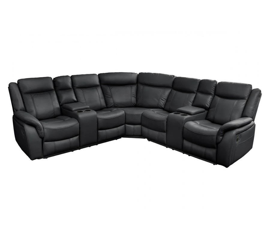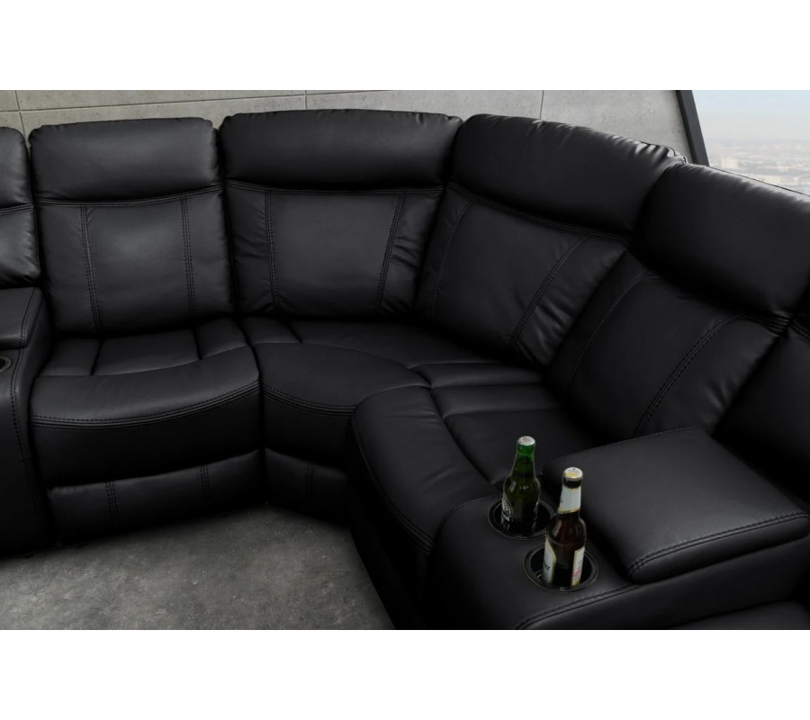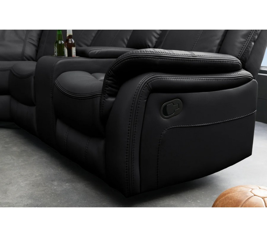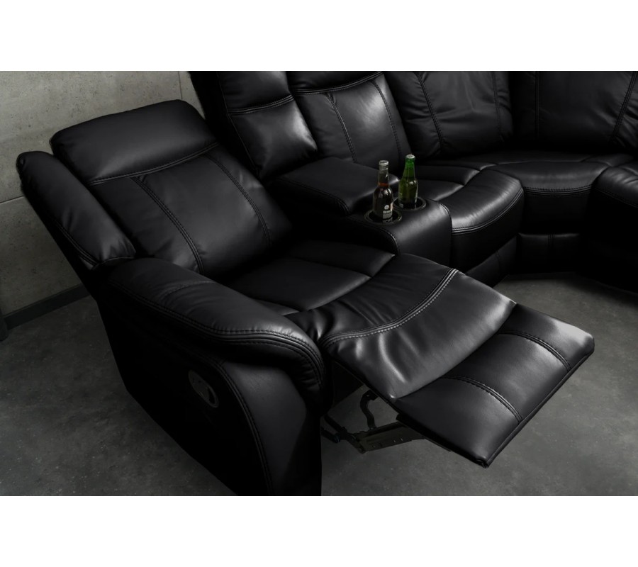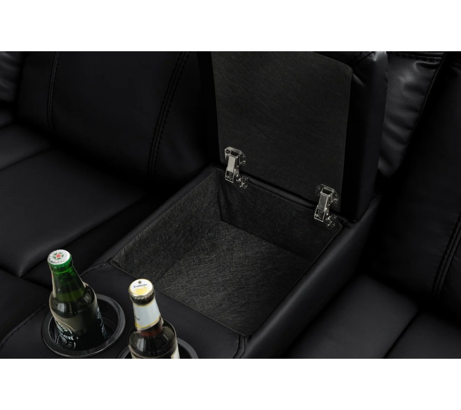 Každé z bočných kresiel disponuje otváracími lakťovými opierkami s integrovanými držiakmi na poháre, čo výrazne zvyšuje komfort pri sledovaní filmov či oddychu. Sedačka je bohato čalúnená, s mäkkými sedákmi, vysokými operadlami a pohodlnými opierkami rúk, ktoré poskytujú výbornú oporu aj pri dlhšom sedení. Eko-kožený poťah v čiernej farbe pôsobí elegantne, moderne a nadčasovo, zároveň je príjemný na dotyk a nenáročný na údržbu.