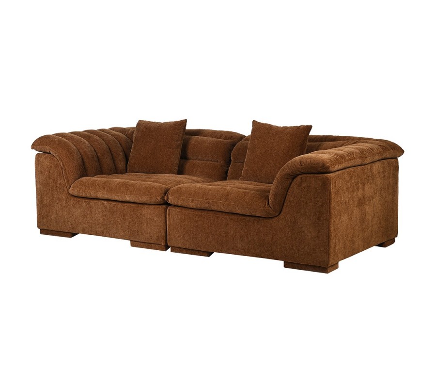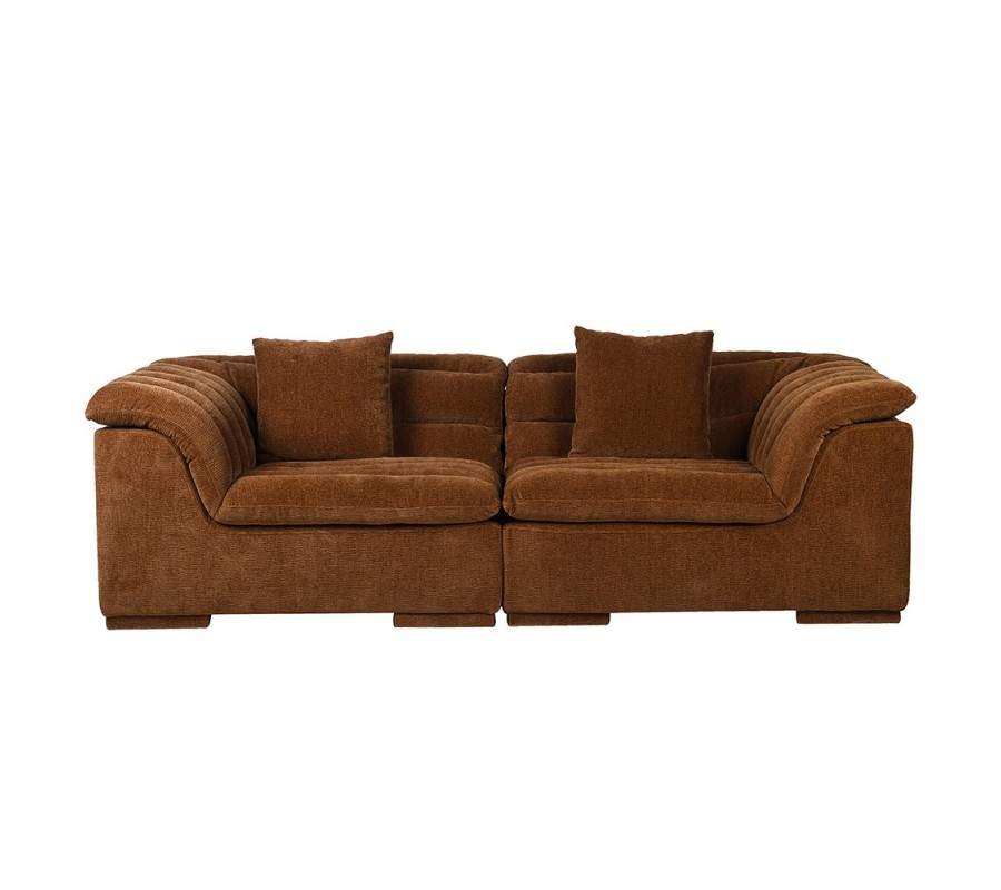 Sedačka je zložená z dvoch samostatných modulov, ktoré je možné používať spolu alebo oddelene, vďaka čomu ponúka flexibilné riešenie usporiadania priestoru. Súčasťou sú dva štvorcové opierkové vankúše, ktoré zvyšujú komfort sedenia a zároveň dotvárajú harmonický vzhľad. Charakteristickým prvkom sú mohutné, bohato čalúnené opierky s prešívaním a jemne zaoblenými tvarmi, ktoré dodávajú sedačke mäkkosť a výrazný dizajnový charakter. Nízke, masívne obdĺžnikové nožičky podčiarkujú stabilitu a celkový robustný dojem.