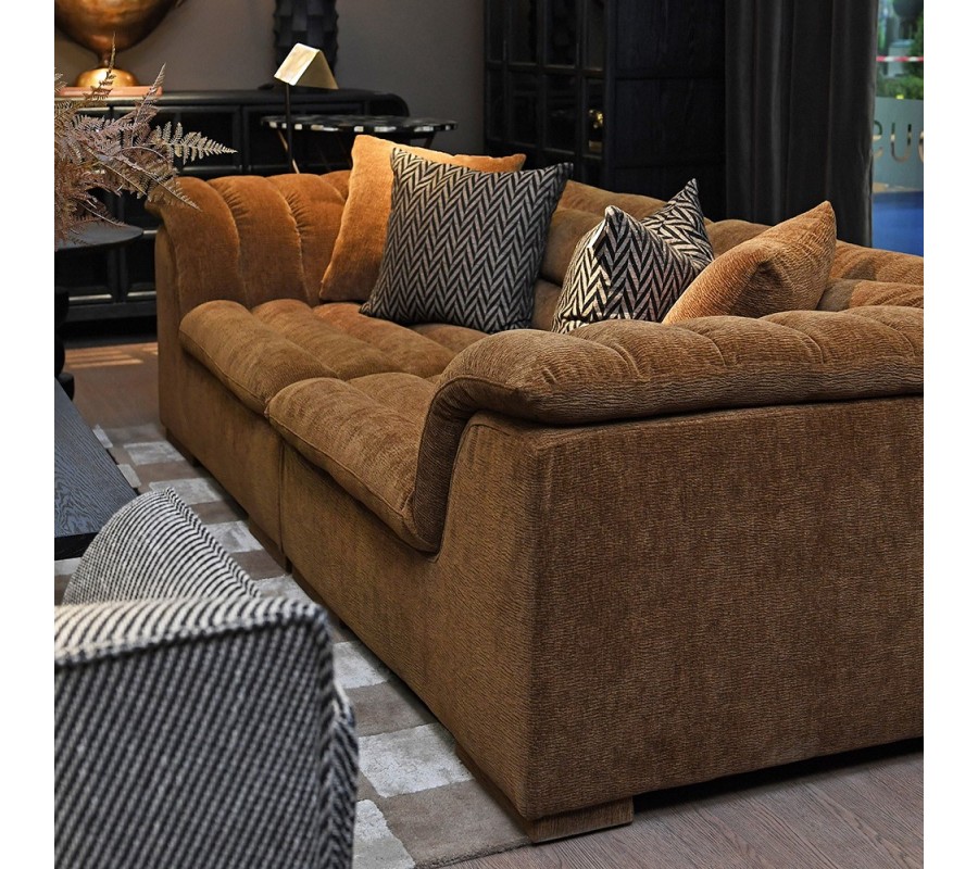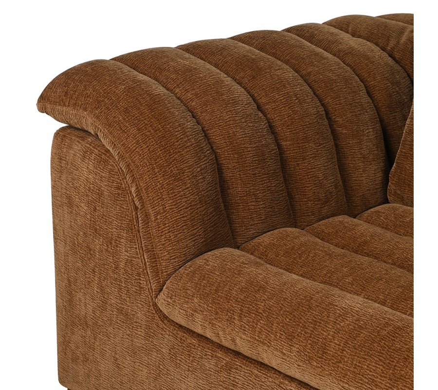 Luxusná dizajnová retro modulárna trojmiestna sedačka Tefav pôsobí výrazne, komfortne a vizuálne robustne. Jej obdĺžnikový tvar, nízky profil a mäkké zaoblené línie odkazujú na retro dizajn v modernom spracovaní. Sedačka je čalúnená kvalitným hnedým textilným poťahom z jemného mikrovlákna, ktorý pôsobí teplo a elegantne, je príjemný na dotyk a vytvára útulnú, pohodovú atmosféru v interiéri.