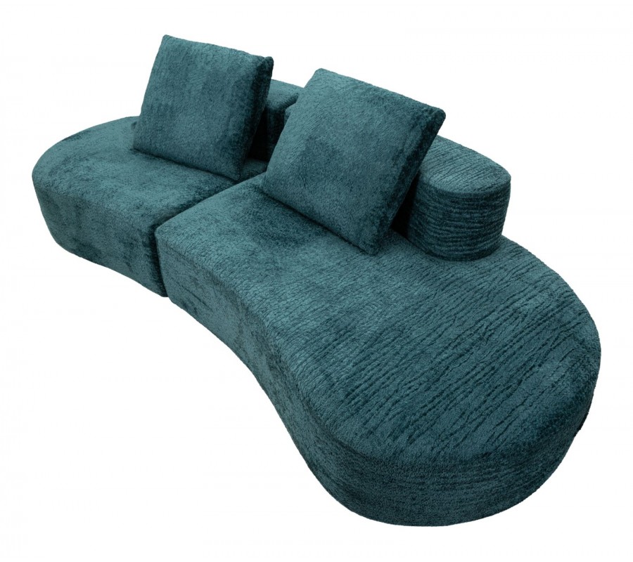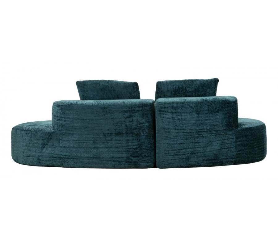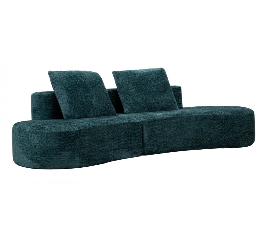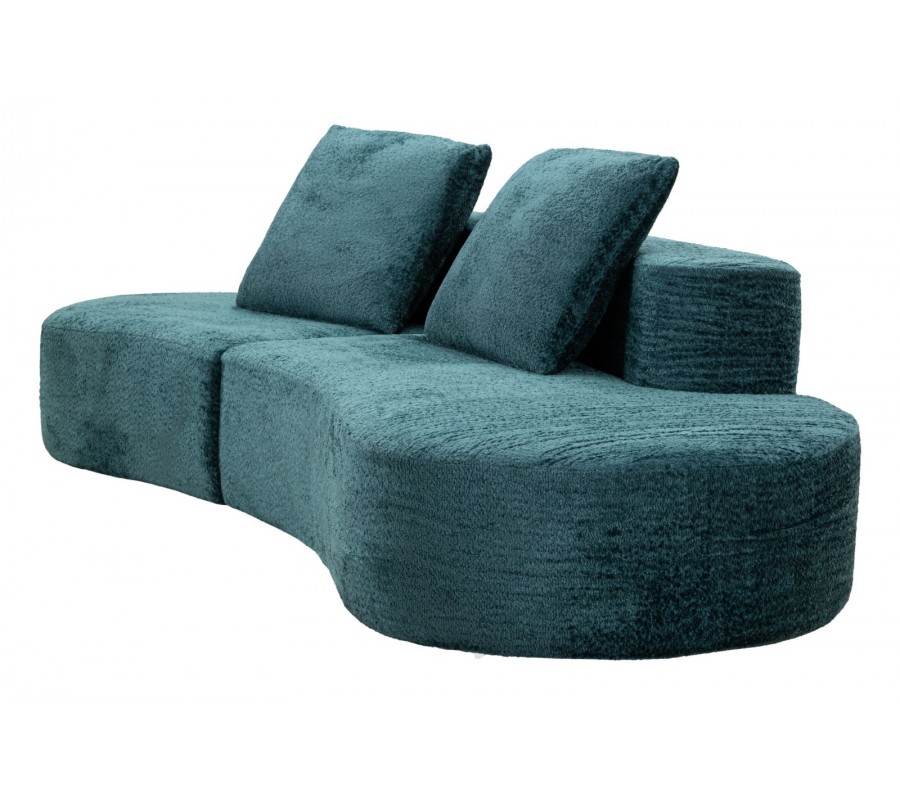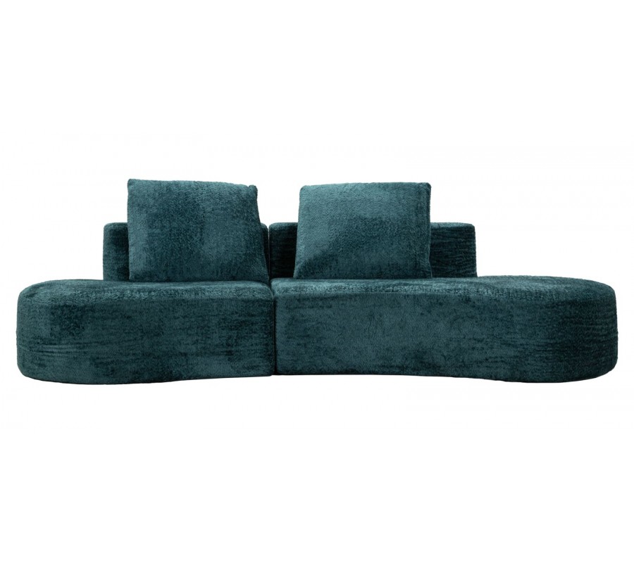 Sedačka pozostáva z dvoch výrazne tvarovaných sedacích častí s plynule nadväzujúcimi líniami. Sedacie plochy sú široké a komfortné, bez bočných opierok, čo podporuje uvoľnený, súčasný vzhľad. Operadlo je umiestnené v stredovej časti sedačky a dopĺňajú ho dva štvorcové oporné vankúše, ktoré poskytujú oporu chrbta a zároveň slúžia ako výrazný dizajnový detail. Celková silueta pôsobí otvorene, vzdušne a vizuálne vyvážene.