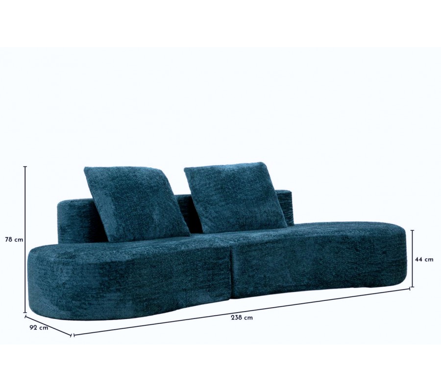 Štvormiestna sedačka Lilos je výrazným dizajnovým prvkom s jemnou inšpiráciou art deco estetikou. Jej organický, oválny tvar pôsobí mäkko a sochársky, vďaka čomu sa prirodzene stáva dominantou interiéru. Výrazná modrá farba v kombinácii s plyšovým poťahom dodáva sedačke hĺbku, vizuálnu mäkkosť a elegantný charakter.
