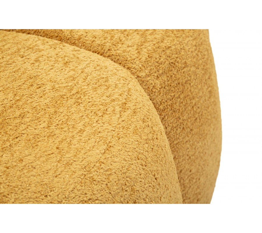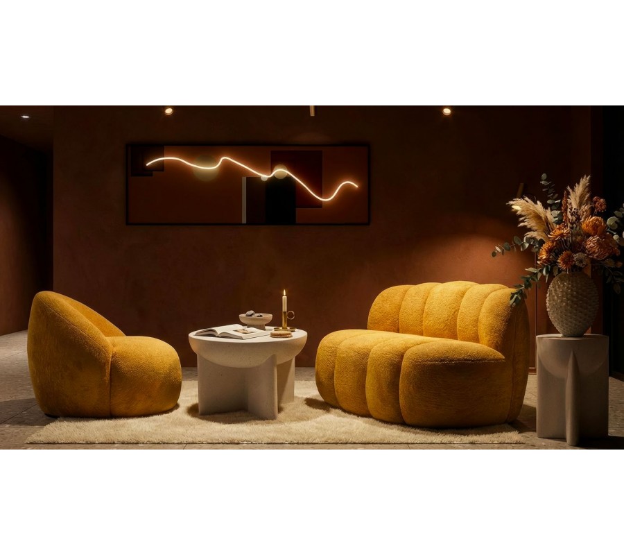 S organicky zaoblenými tvarmi výborne korešponduje plyšový poťah s nízkym vlasom, ktorý je mäkký a mimoriadne príjemný na dotyk. Mikrovlákno mu zaručuje výbornú pevnosť a odolnosť voči vplyvom každodenného používania. Výrazná a sýta žltá farba prináša do dizajnu jemný nádych extravagancie a v priestore pritiahne pozornosť. Zároveň je však teplá a pôsobí útulne.