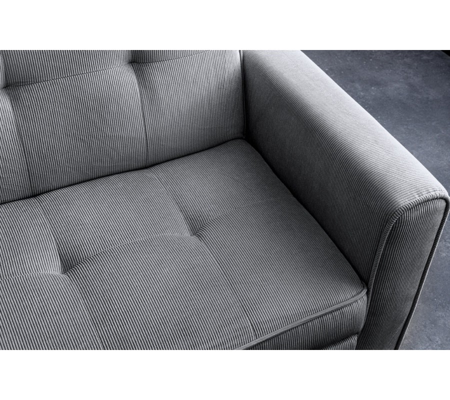 Sedačka je čalúnená menčestrovým poťahom v tmavosivej farbe, ktorý pôsobí elegantne, nadčasovo a je príjemný na dotyk. Sedacia časť aj chrbtová opierka sú prešívané do štvorcového vzoru, ktorý dodáva dizajnu štruktúru a moderný vzhľad. Dekoratívne prešívanie lemu na sedadle, bočných opierkach aj operadle podčiarkuje precízne spracovanie a vytvára vizuálne jednotný celok.