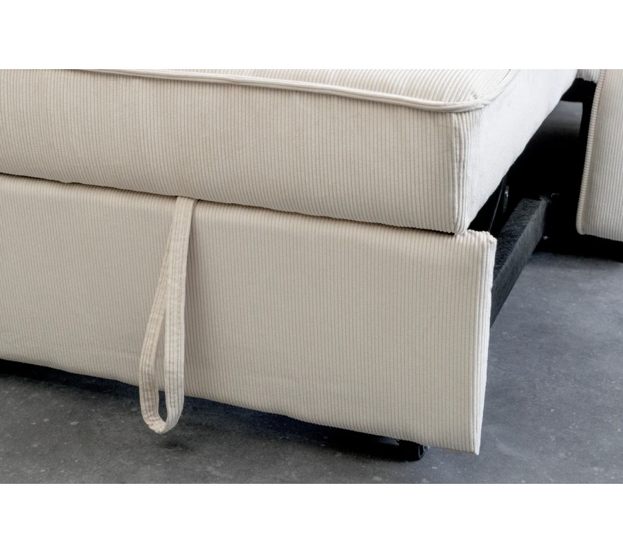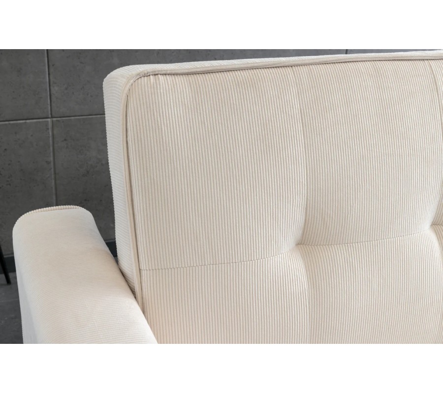 Sedačka je čalúnená menčestrovým poťahom v béžovom odtieni, ktorý pôsobí hrejivo, jemne a nadčasovo. Sedacia časť aj chrbtová opierka sú prešívané do štvorcového vzoru, ktorý dodáva sedačke elegantnú štruktúru a vizuálnu hĺbku. Prešívaný lem na sedadle, bočných opierkach aj operadle zvýrazňuje detailné spracovanie a podčiarkuje moderný charakter dizajnu.