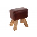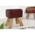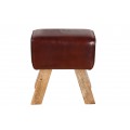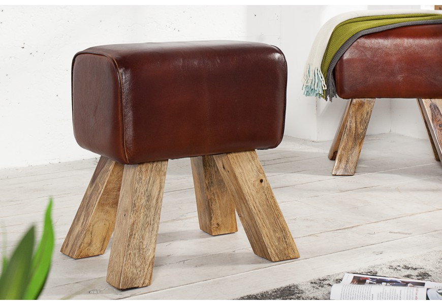Vidiecka obdĺžniková taburetka Bock s pravým koženým červeno hnedým poťahom a masívnymi drevenými nožičkami 45 cm