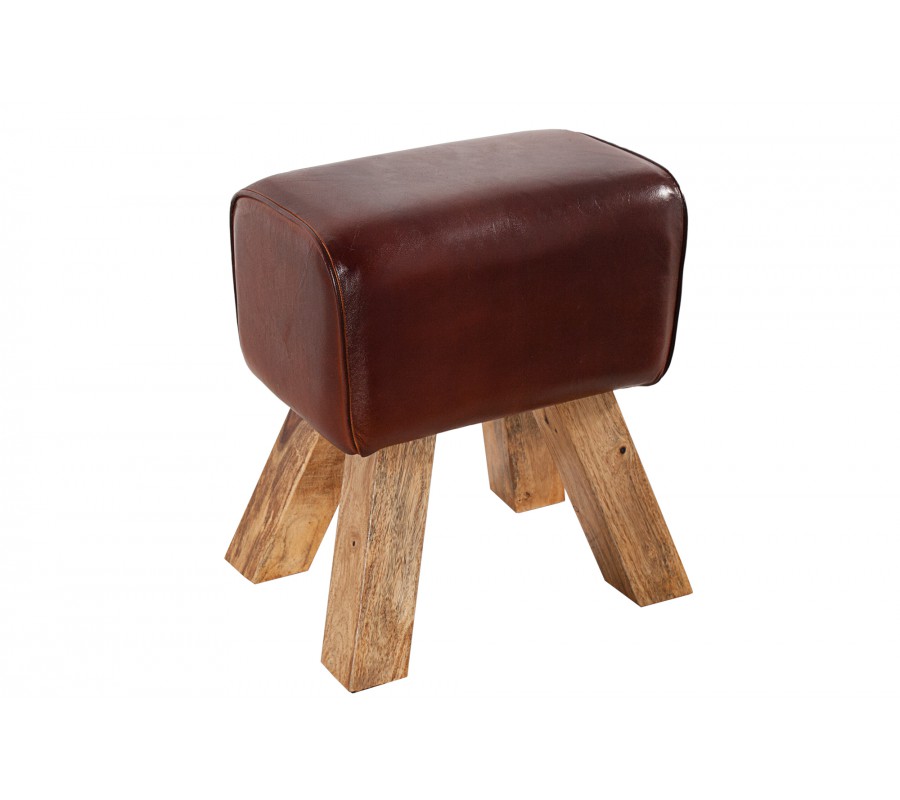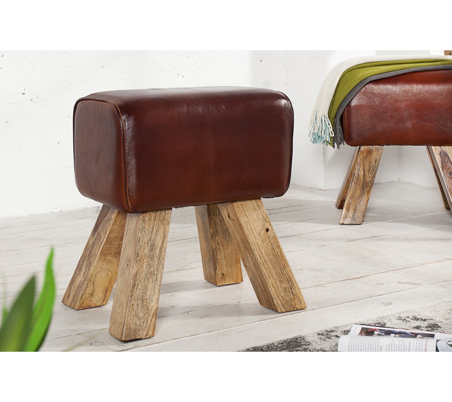 Taburetka Bock vnesie do interiéru autentickú vidiecku atmosféru vďaka masívnym dreveným prvkom a poctivému koženému spracovaniu. Jej obdĺžnikový tvar a vysoký sed pripomína tradičné gymnastické náčinie či odkladacie kozy na sedlá pre kone, čo jej dodáva charakteristický rustikálny nádych s mierne športovým akcentom.