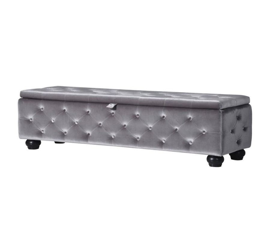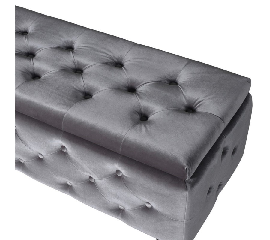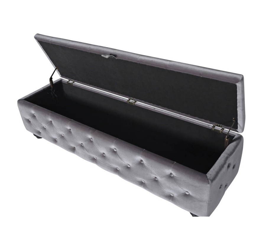 Štýlový taburet Alcala v sivom zamatovom poťahu je doplnený jedinečným prešívaním v Chesterfield štýle. Zamatové čalúnenie sa nachádza na celom povrchu taburetu a je doplnené čiernymi ozdobnými drevenými nohami. Okrem pohodlného usadenia počas krátkej konverzácie či počas obliekania a obúvania môžete taburet využiť aj ako úložný priestor na rôzne predmety. Úložný priestor sa skrýva za vyklápacím sedadlom taburetu a je v elegantnom čiernom prevedení. Široký taburet je obľúbenou voľbou pri zariaďovaní luxusných spální ako dopnok k prednému čelu postele. Okrem doplnenia spální a obývačiek sa dá taburet skvele využiť v dlhých predsieňach či chodbách ako lavica na sedenie s úložným priestorom. Taburet je vhodné kombinovať s akýmkoľvek dreveným nábytkom či odvážnymi prvkami lesklého Art-deco štýlu. Ak máte radi štýlovú čistotu, odporúčame taburet kombinovať s postelami z kolekcie Alcala.