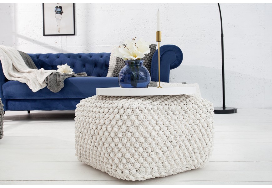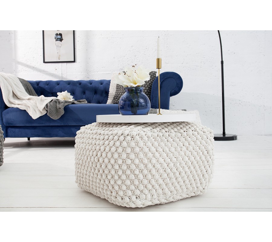 Dizajnový biely Cosy Pouf je dokonalým doplnkom do moderne, dizajnovo či rustikálne zariadených domácností. Je jedinečným kúskom práve vďaka svojej účelovosti a praktickosti. Je možné ho použiť ako konferenčný stolík aplikovaním tácky alebo ako pohodlnú taburetku. Svojou štruktúrou dodáva do priestoru domácku a útulnú atmosféru. Ak hľadáte zaujímavý kúsok do vášho interiéru, dizajnový biely Cosy Pouf je pre vás súci. Svojou elegantnou bielou farbou, textúrou a tvarom nenechá žiadnu návštevu bez povšimnutia.
