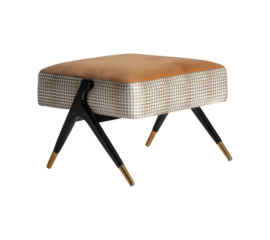 Art-deco horčicový čalúnený luxusný taburet Brilon s vysokými čiernymi nohami a zlatými prvkami 70cm
