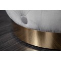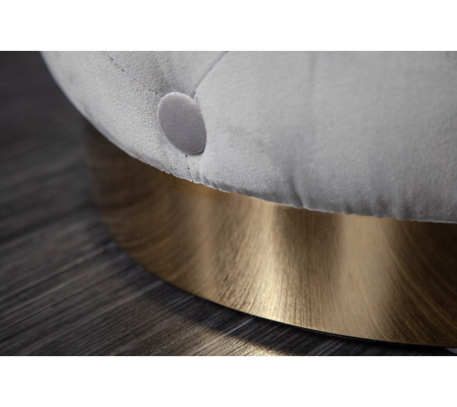 Dizajnová a nadčasová taburetka Modern Barock je vyrobená vo vkusnom zámockom štýle, ktorý kladie dôraz predovšetkým na šmrnc a veľkoleposť. Okrúhla taburetka Modern Barock disponuje naozaj nádherným sivým zamatovým poťahom, ktorého vlas má strieborný nádych a jeho povrchová úprava s aplikáciami je v nestarnúcom štýle chesterfield. Spodná časť dizajnovej taburetky je doplnená o zlatý kruh, ktorý dokonale dotvára jeho luxusný vzhľad. Zabezpečte svojim nohám odpočinok po dlhom dni využitím tohto jedinečného taburetu a obohaťte tak svoju domácnosť o naozajstný nádych luxusu. Či už sa jedná o obývačku, kanceláriu či príjemnú čajovňu, taburet Modern Barock sa postará o pompézny akcent, ktorý odporúčame kombinovať najmä s inými luxusnými materiálmi či povrchmi, akými disponujú napríklad zlaté sochy.