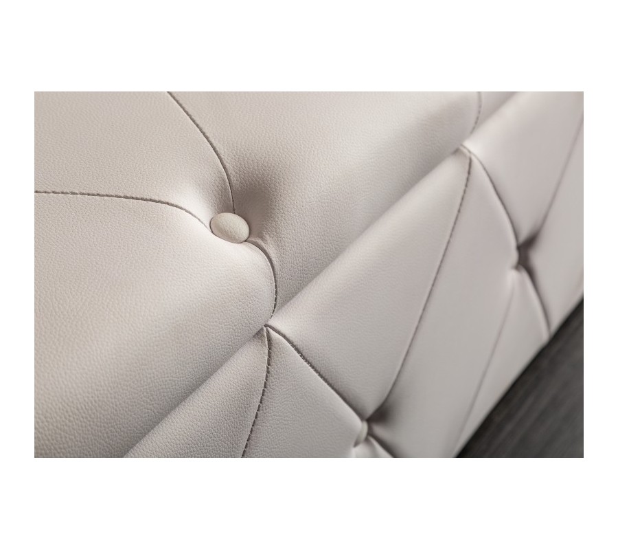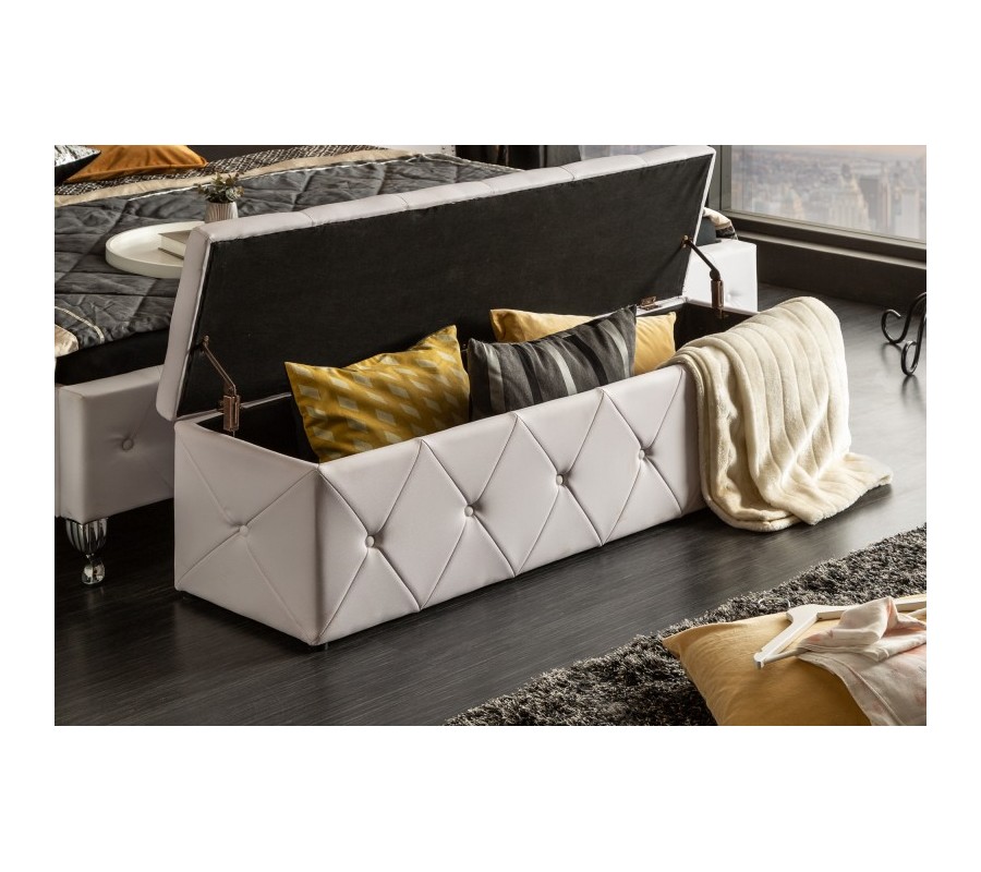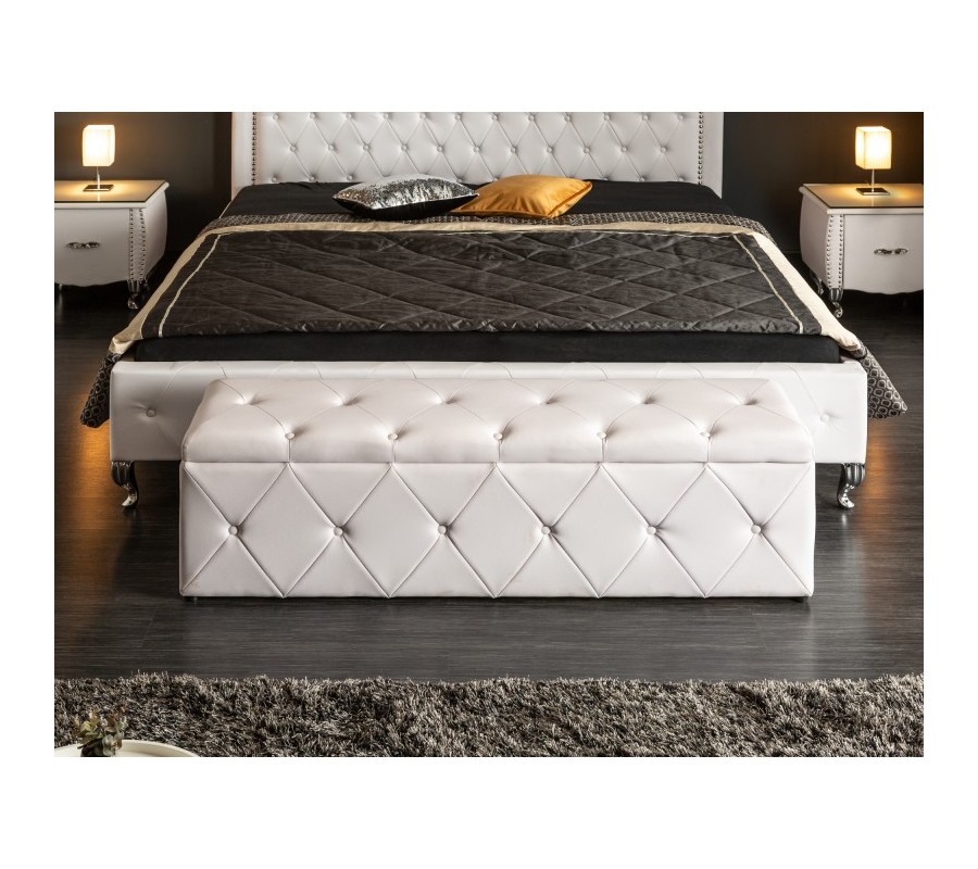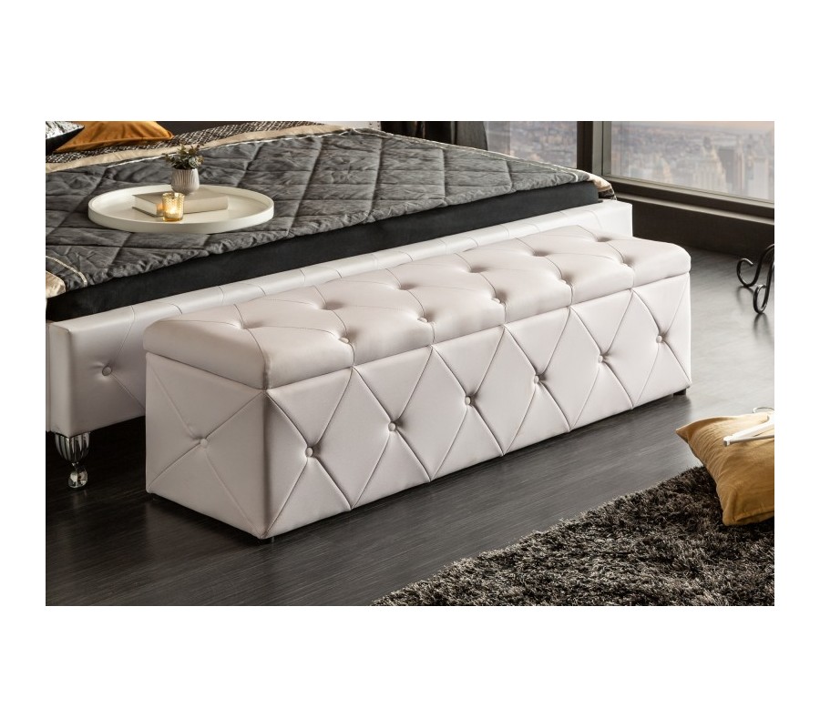 Štýlový prešívaný taburet Caledonia v neutrálnej bielej farbe sa stane dokonalým doplnením vašej spálne. Kvalitný poťah s koženým vzhľadom sa vďaka neutrálnemu odtieňu veľmi ľahko sa kombinuje. Okrem pohodlného usadenia počas krátkej konverzácie či počas obliekania a obúvania môžete taburet využiť aj ako úložný priestor na rôzne predmety. Úložný priestor sa skrýva za vyklápacím sedadlom taburetu a je v elegantnom čiernom prevedení. Široký taburet je obľúbenou voľbou pri zariaďovaní luxusných spální ako doplnok k prednému čelu postele. Okrem doplnenia spální a obývačiek sa dá taburet skvele využiť v dlhých predsieňach či chodbách ako lavica na sedenie s úložným priestorom.