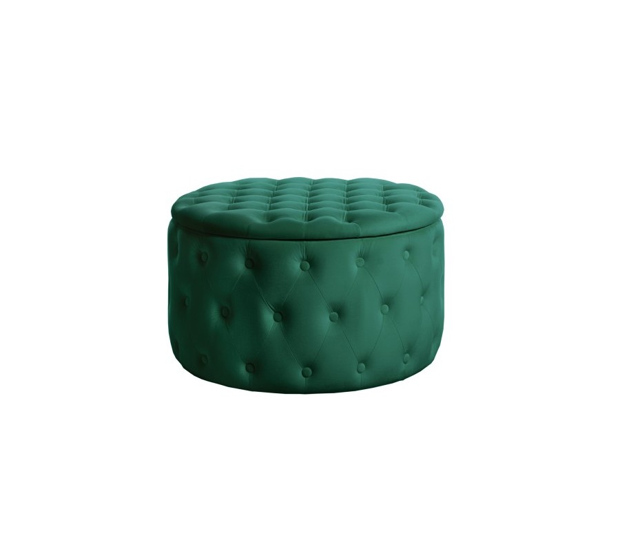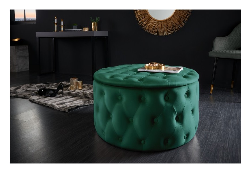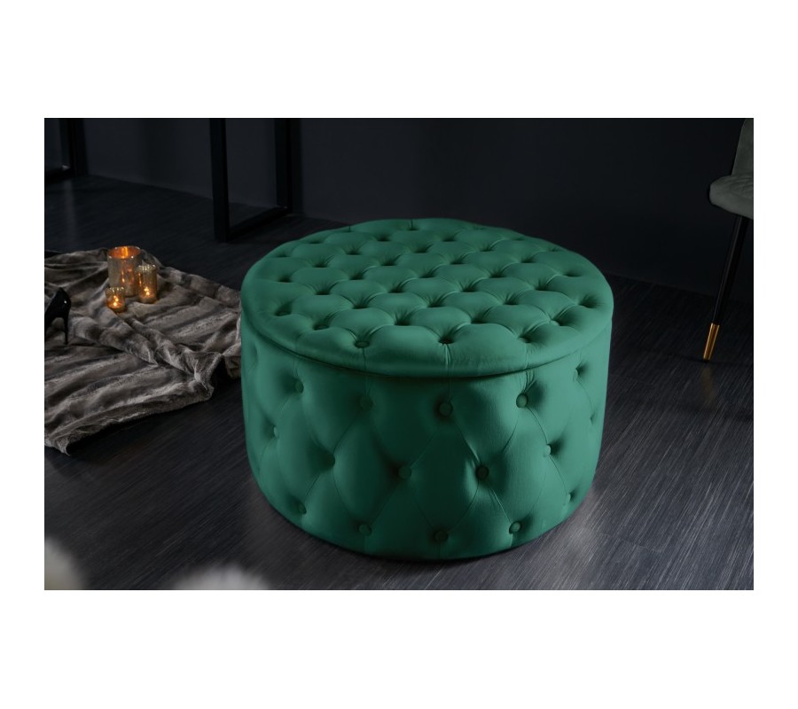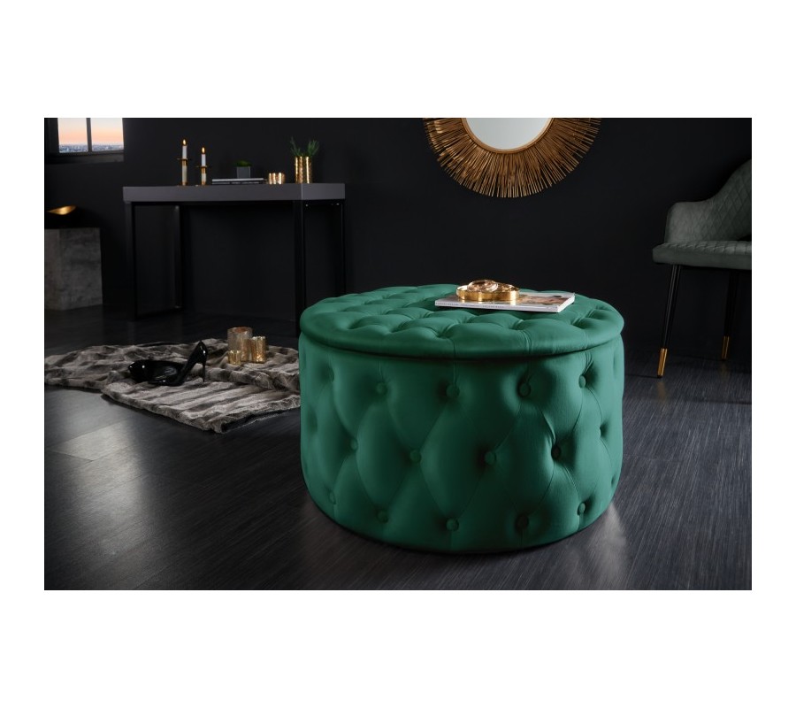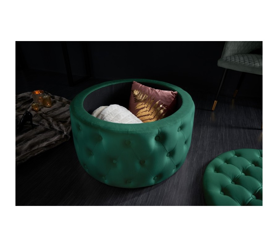 Elegantná taburetka Modern Barock predstavuje štýlový súlad nadčasového dizajnu s klasickými prvkami. Taburetka kruhového tvaru zaujme svojou výraznou smaragdovozelenou farbou a príjemným zamatovým čalúnením, ktoré dopĺňa klasické chesterfield prešívanie. Vnútro taburetky je možné využiť ako praktický úložný priesor na vankúše, deky či iné predmety. Elegantný dizajn krásne zapadne do obývačiek ladených v modernom alebo art-deco štýle. Luxusný vzhľad dosiahnete najmä umiestnením do tmavších priestorov a kombináciou s nábytkom z kovu či skla. Taburetka Modern Barock váš interiér krásne oživí a zútulní!