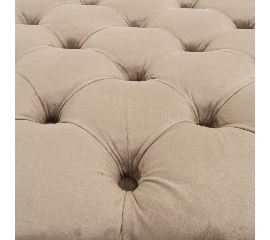Naša luxusná taburetka Chelsea predstavuje prepojenie barokového honosného štýlu a nadčasovej elegancie. Zaujme svojím príjemným zamatovým čalúnením v univerzálnej béžovej farbe, ktoré dopĺňa prešívanie typické pre štýl chesterfield. Poťah vkusne dopĺňajú vyrezávané drevené nožičky, ktoré vytvárajú jemný nádych barokového či rustikálneho štýlu. Vďaka neutrálnej farebnosti je taburetka kúskom, ktorý poľahky doladíte aj do farebnejšie ladených priestorov. Hodí sa ako doplnok luxusných obývačiek a spální, ale príjemne doplní aj priestory beauty salónov či tématických kaviarní. Taburetku Chelsea odporúčame kombinovať aj s ďalšími rovnomennými kúskami z našej kolekcie, ako napríklad čalúnené kreslo či stoličky.