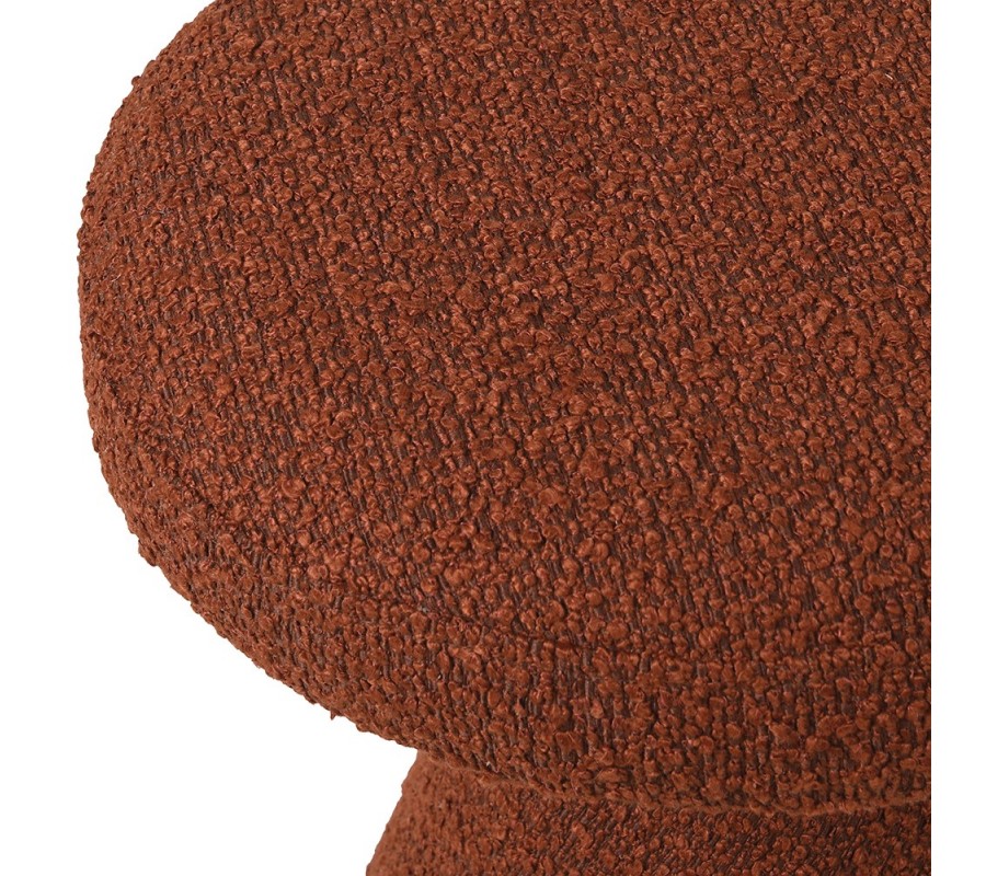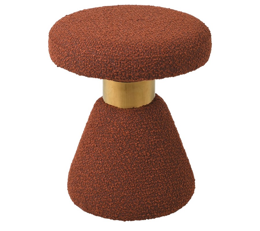 Dizajnová taburetka Mey je krásnym kúskom, ktorý vám dokrášli a dotvorí vašu obývačku zariadenú v art-deco štýle. Taburetke dominuje veľmi pohodlné buklé čalúnenie v hrdzavo hnedej farbe, ktoré sa vyznačuje svojími jemnými a početnými kučierkami na povrchru čalúnenia. Sedacia časť taburetky Mey je vložená do kovového predelu zlatej farby v tvare obruče, ktorý vytvára ľahkú kombinovateľnosť s kovovými doplnkami a nábytkom v art-deco štýle. Podstava taburetky Mey je v kuželovitom tvare, čo osvieži celkový dizajn tohto produktu. Vďaka svojmu štýlovému čalúneniu a zlatým prvkom odporúčame kombinovať taburetku Mey v tmavšie zariadených art-deco obývačkách v kombinácií s nábytkom a doplnkami so zlatými prvkami, v komibnácií s hnedou farbou a živou zeleňou.
