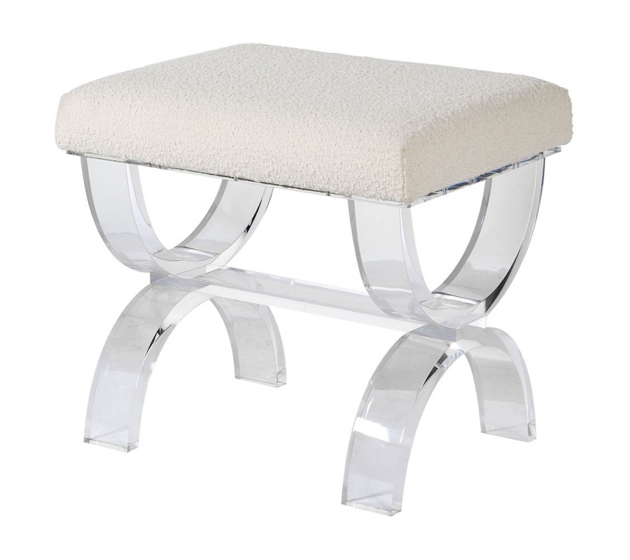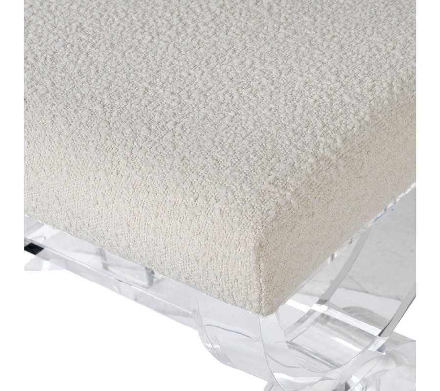 Buklé taburetka Chantelle v modernom vyhotovení je krásnym kúskom pre dokrášlenie štýlových moderných, či art-deco obývačiek. Dizajnova stránka taburetky Chantelle sa môže pýšiť štýlovým buklé čalúnením v bielej farbe s nádychom krémovej a smotanovej farby. Dizajnu taburetky Chantelle dominujú priehľadné akrylové nožičky, ktoré sa nesú v tvare dvoch opačných polkruhov. Štýlový vzhľad taburetky Chantelle je veľmi ľahko kombinovateľný v moderných interiéroch vďaka svojmu svetlému bielemu prevedeniu, pričom akrylové polkruhové nožičky vyniknú najmä s moderným skleneným a priehľadným nábytkom.