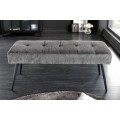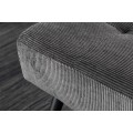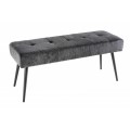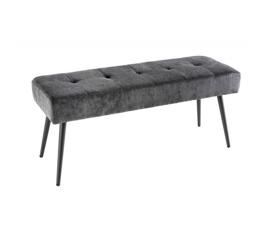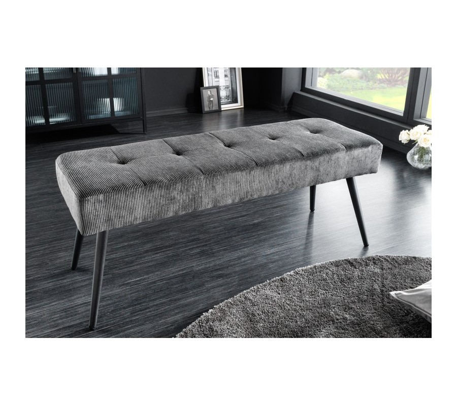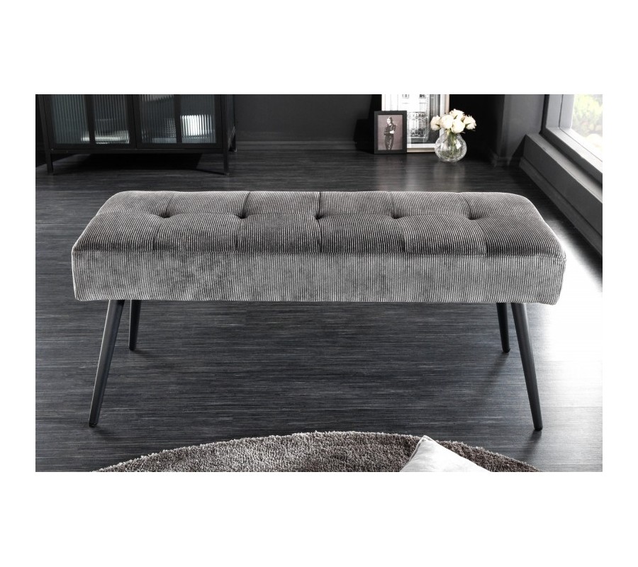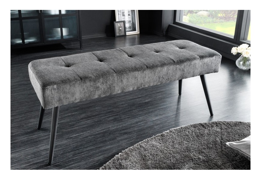 Moderná lavica Soreli Vám ponúka príjemné menčestrové čalúnenie v tmavosivej farbe, ktoré je obohatené o dizajnové prešívanie, podobné štýlu Chesterfield. Retro nádych menčestrového čalúnia štýlovo doplnia štyri kovové nožičky s práškovým nástrekom, ktoré prinesú Vášmu interiéru industriálny nádych.