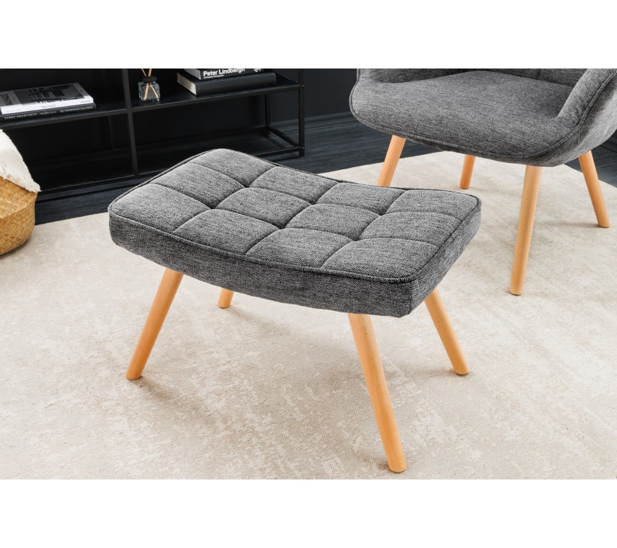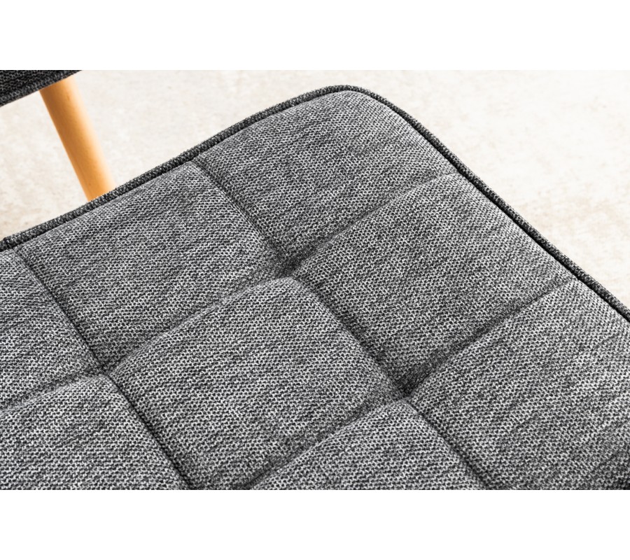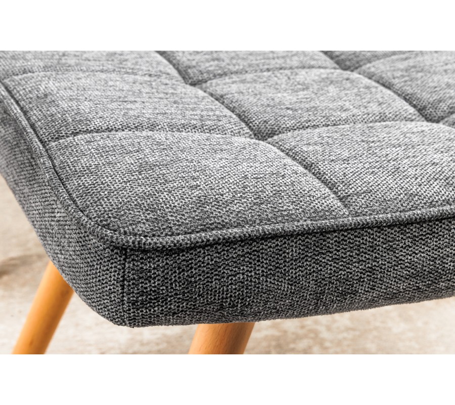 Silueta nábytku je jednoduchá a korešponduje s estetikou škandinávskeho štýlu. Sedacia časť je jemne prehnutá a uložená na štyroch mierne zošikmených nožičkách. Poťahová látka je hrubo tkaná a tmavá sivá je melírovaná svetlejším vláknom, čo dodáva nábytku vizuálnu hĺbku. Čalúnenie je prešívané do lineárneho štvorcového vzoru, čo zdôrazňuje jeho mäkkosť. Nožičky majú prírodnú hnedú farbu, čo do dizajnu prináša teplý naturálny dotyk.