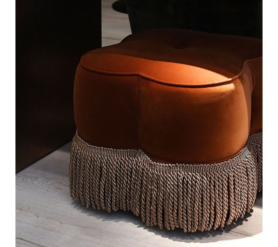 Taburet má výrazný a originálny vzhľad s oblými hranami. Jeho silueta pripomína štvorlístok alebo okvetný lístok, čím do priestoru prináša hravý a mäkký estetický dojem. Na vrchu sa nachádza jemný detail v podobe centrálneho prešitia, ktoré pridáva vizuálnu hĺbku a zároveň zachováva jeho hladký a elegantný povrch.