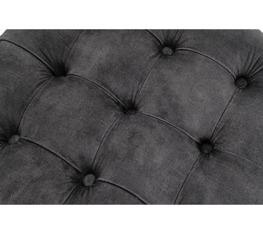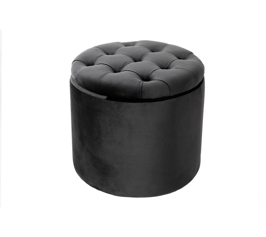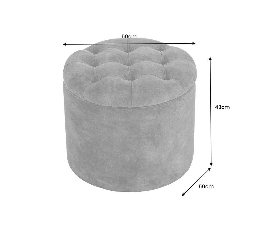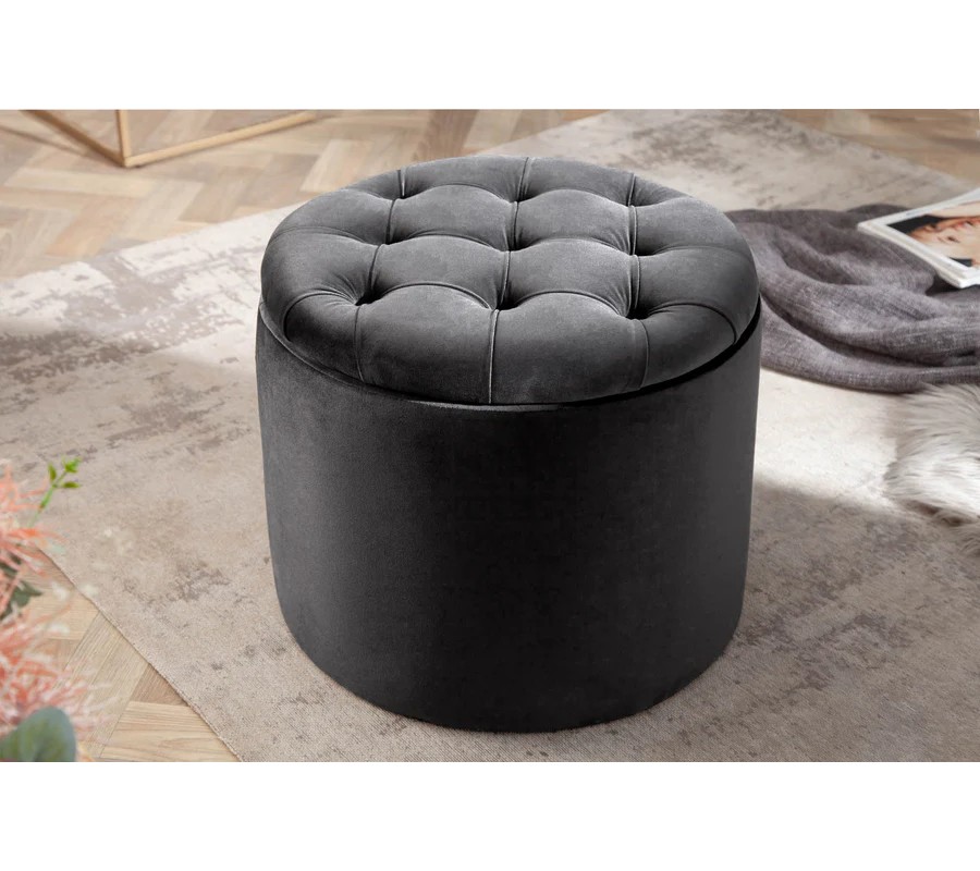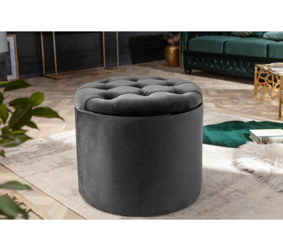 Praktický okrúhly tvar a jemné línie prinášajú pocit luxusu a pohodlia. Vďaka odnímateľnému poklopu ponúka taburetka praktický úložný priestor na ukladanie vankúšov, diek alebo časopisov. Vrchná časť taburetky je zdobená elegantným chesterfield prešívaním s gombíkmi, ktoré jej dodávajú sofistikovaný vzhľad.