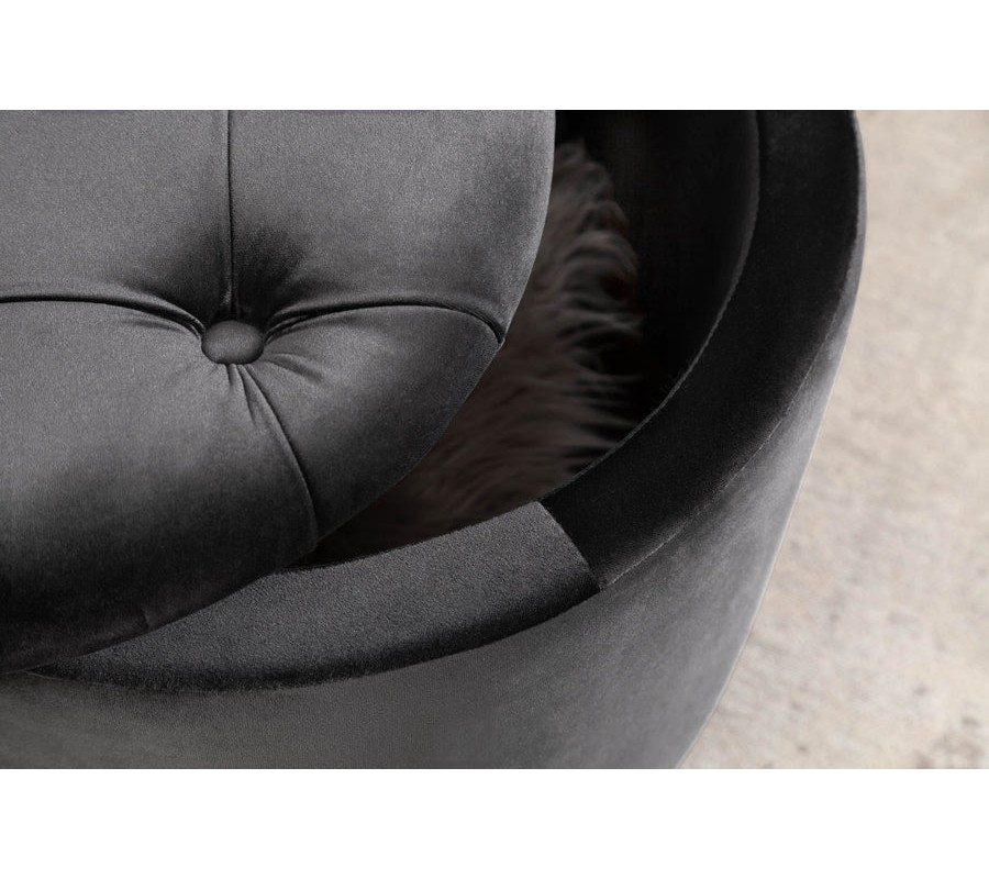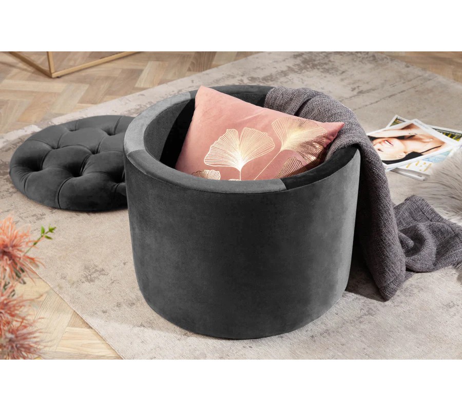 Dizajnová tmavá sivá taburetka Modern Barock okrúhleho tvaru v glamour štýle so zamatovým poťahom s úložným priestorom 50cm