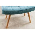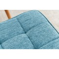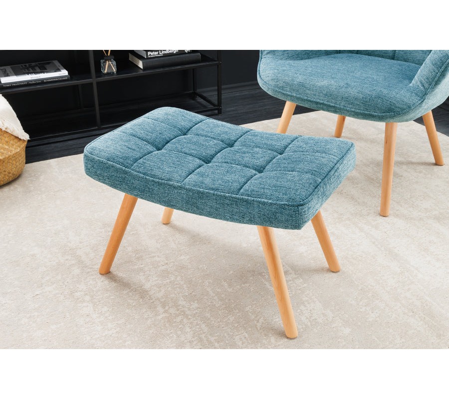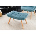 Štýlová škandinávska podnožka Scandy v modrej farbe s prešívaným poťahom a drevenými nožičkami 60 cm