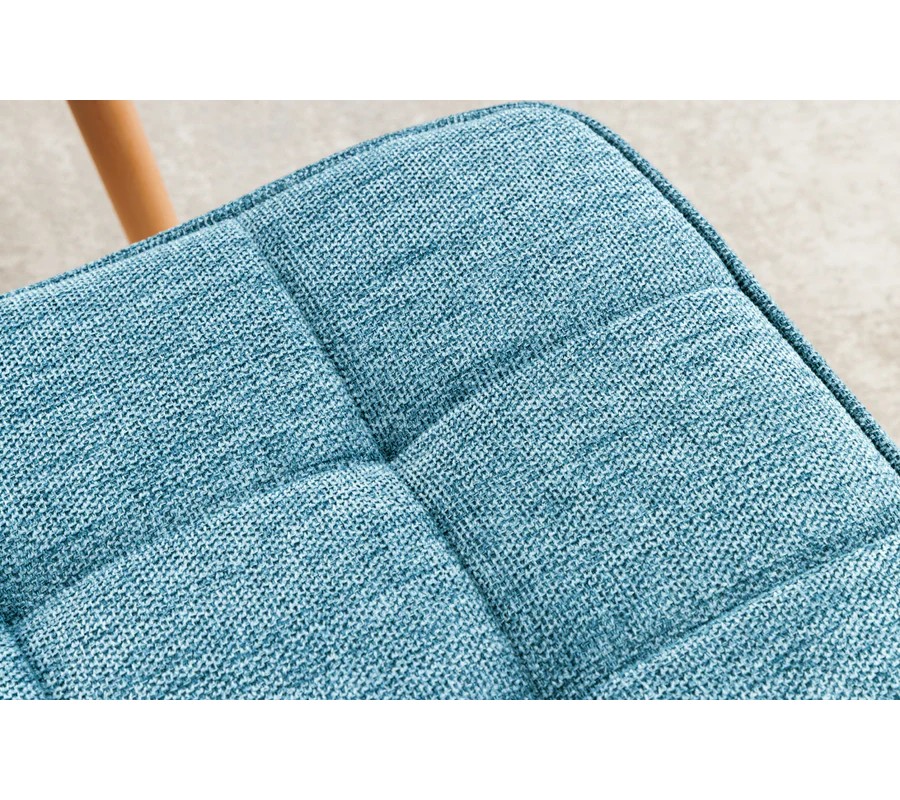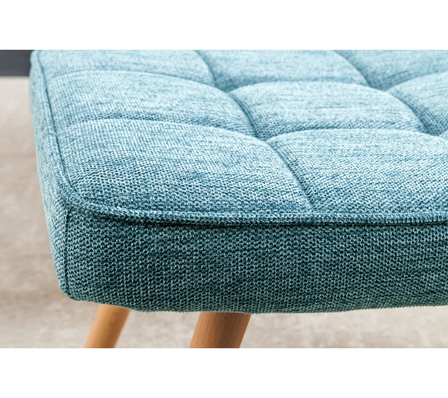 Podnožka Scandy má elegantný obdĺžnikový tvar s jemne zaoblenými rohmi, ktorý pôsobí útulne a príjemne. Poťah je vyrobený z textílie s výraznou štruktúrou v tlmenej modrej farbe, ktorá pridáva svieži a moderný nádych. Sedacia časť je prešívaná do štvorcového vzoru.
