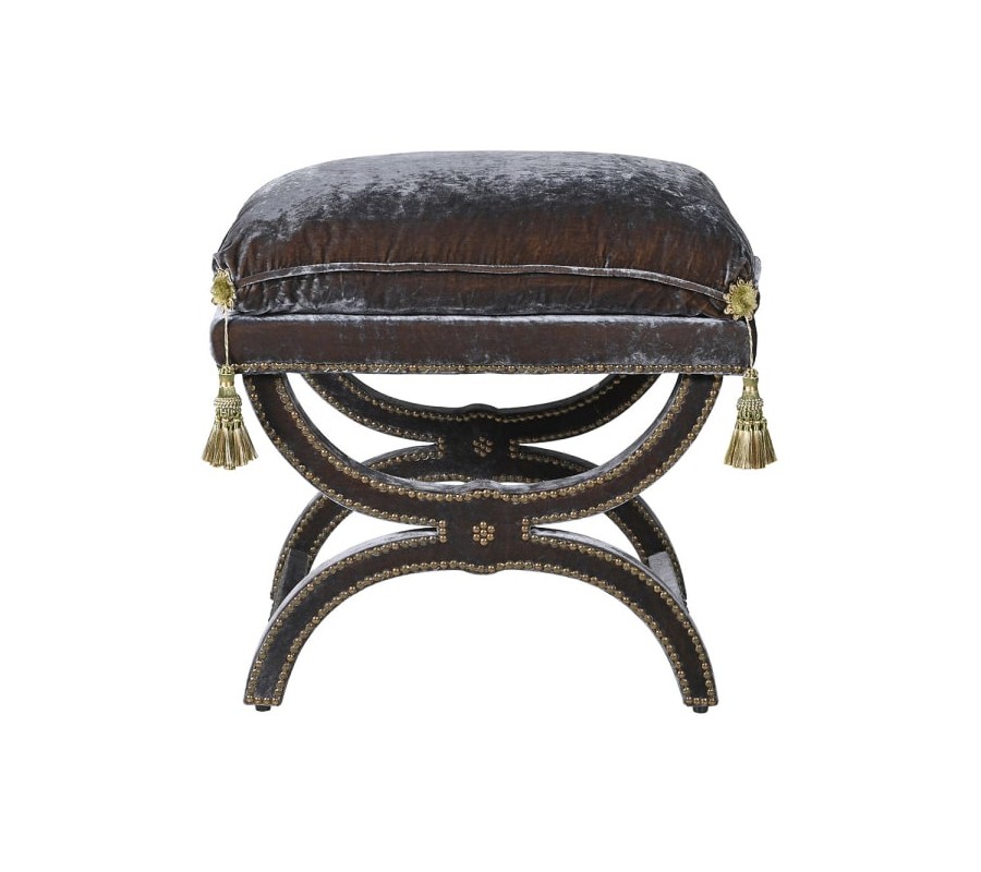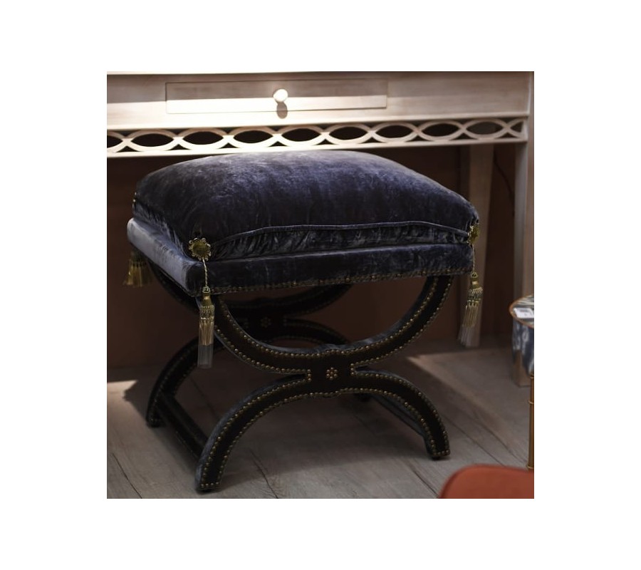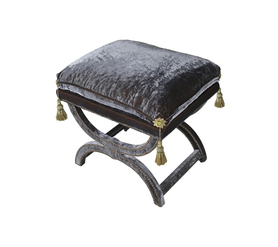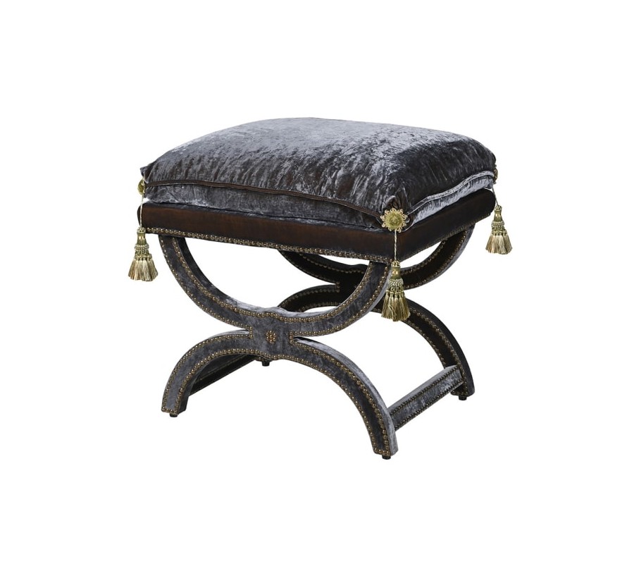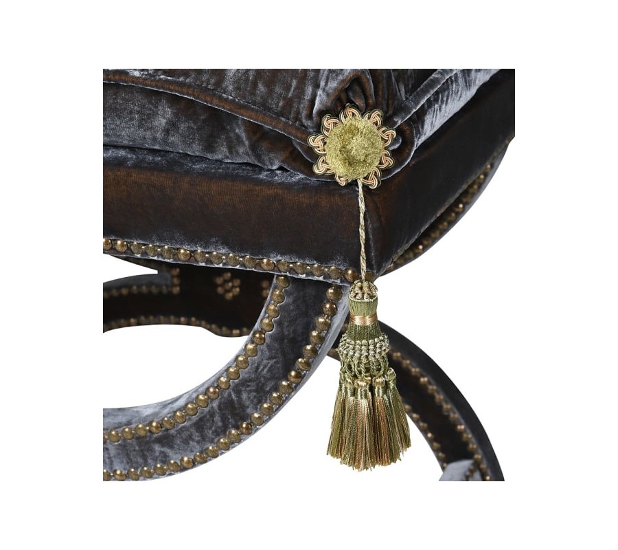 Na rohoch sedacej časti sa nachádzajú ozdobné zlaté strapce, ktoré sú pripevnené na kovových dekoratívnych kvetoch, čím taburetka získava unikátny šarm. Povrch je kombináciou hebkého a lesklého zamatu a tmavého dreva so zdobenou povrchovou úpravou.