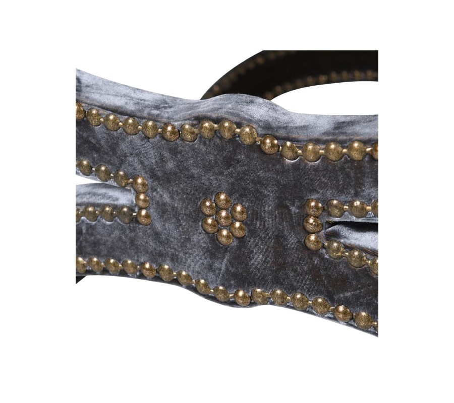 Elegantná taburetka Sall v klasickom glamour štýle predstavuje luxusný doplnok, ktorý okamžite upúta pozornosť svojím výrazným dizajnom. Sedacia časť má štvorcový tvar a je bohato čalúnená s použitím zamatového poťahu v tmavošedej farbe, ktorý vytvára jemný lesklý efekt a zvyšuje celkový dojem honosnosti. Robustná konštrukcia v tvare krížených oblúkov, ktoré sú taktiež pokryté zamatom, slúži ako stabilná podnož a je zdobená jemnými nitmi.
