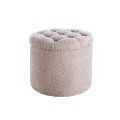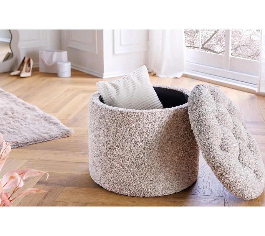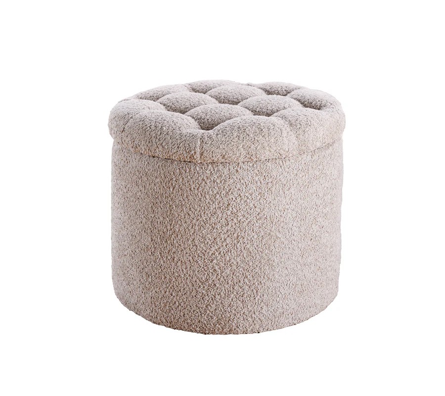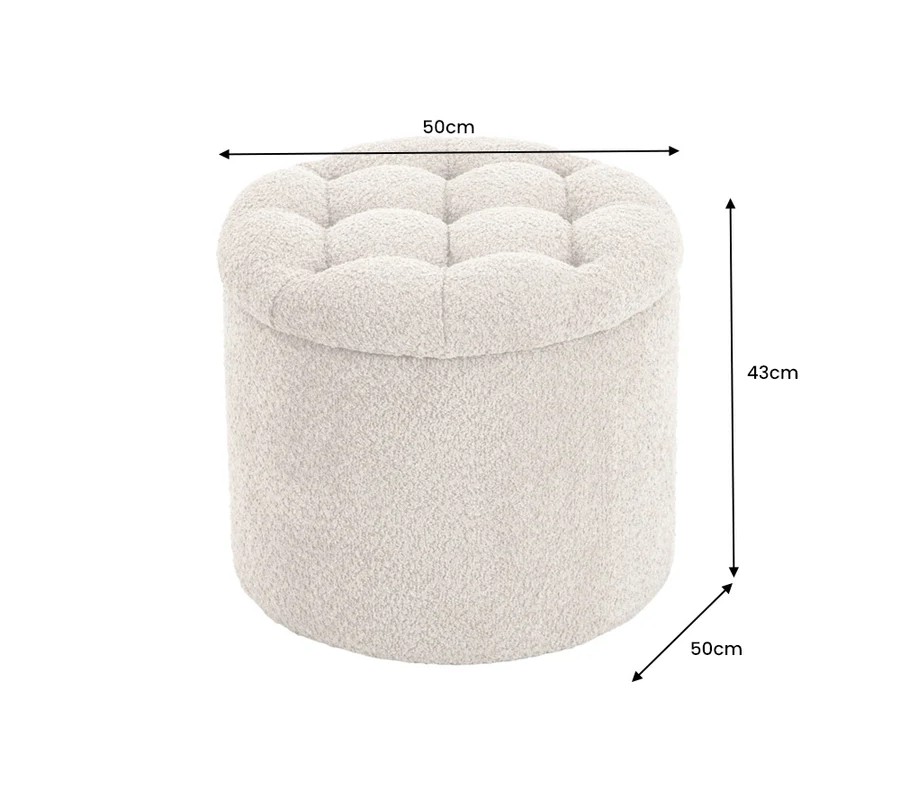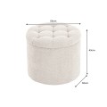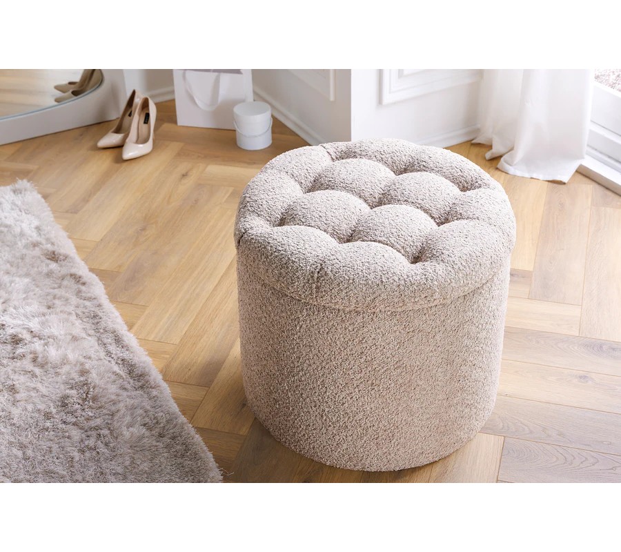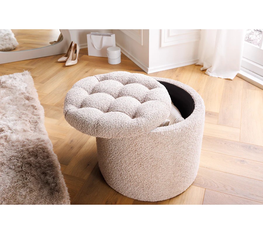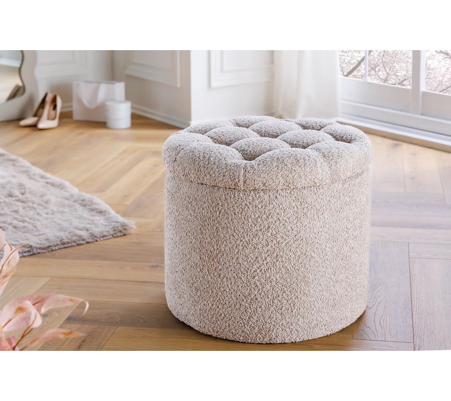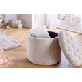 Moderná okrúhla baroková bouclé taburetka Modern barock v šampanskej béžovej farbe s úložným priestorom 50 cm